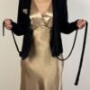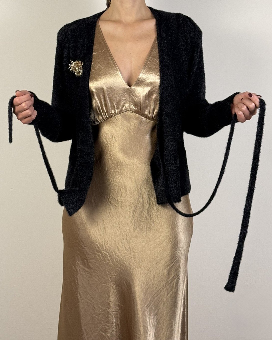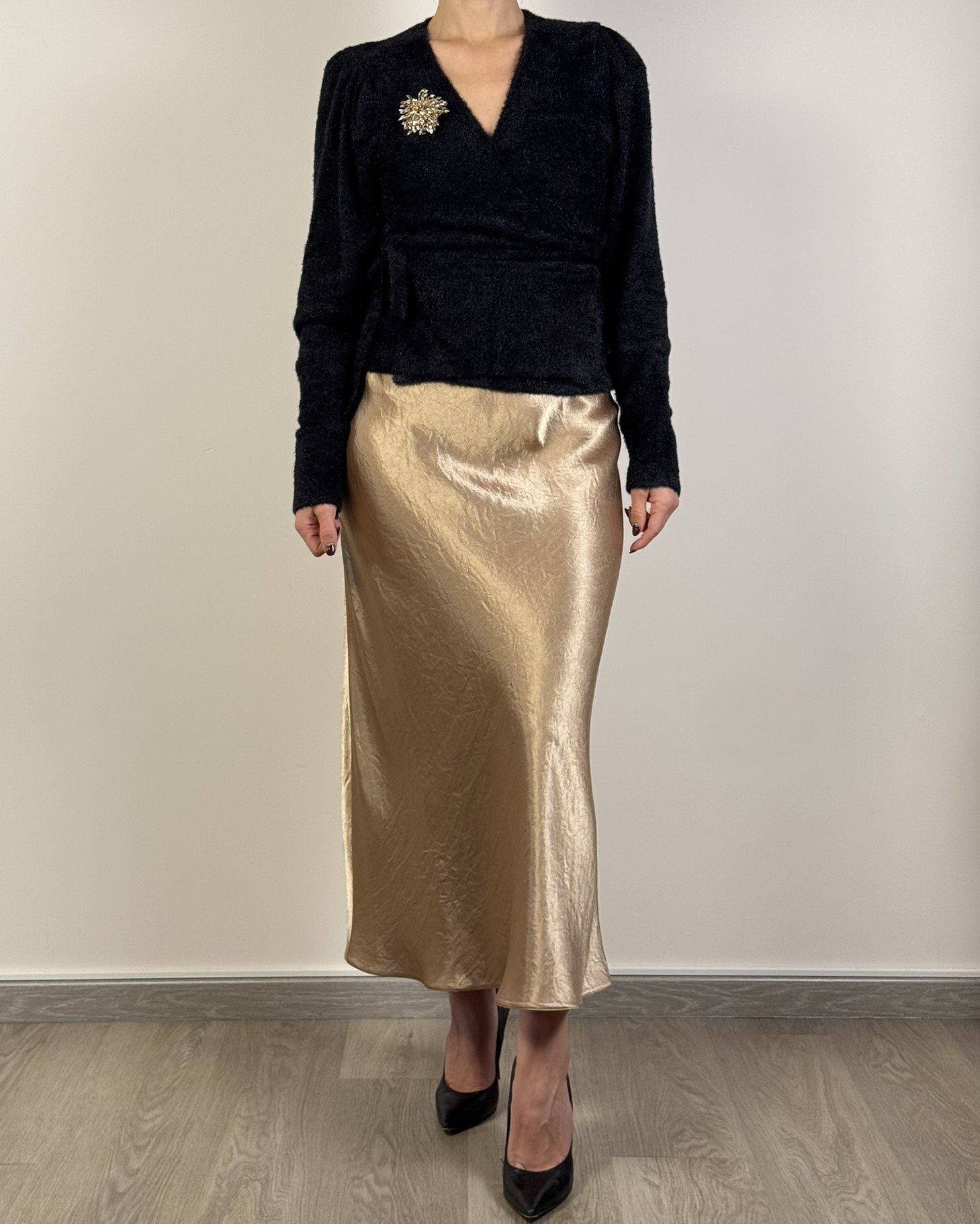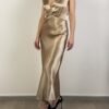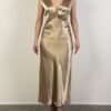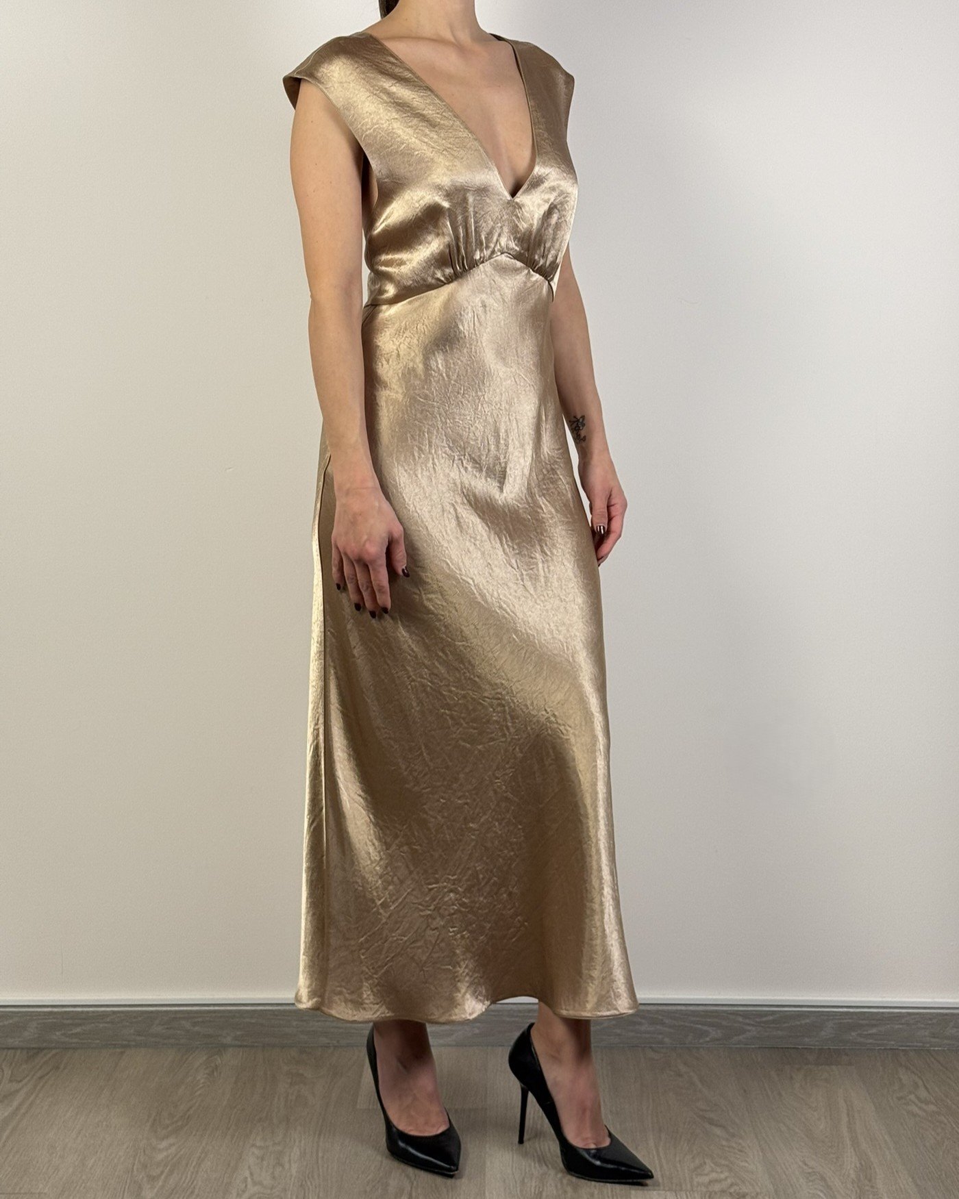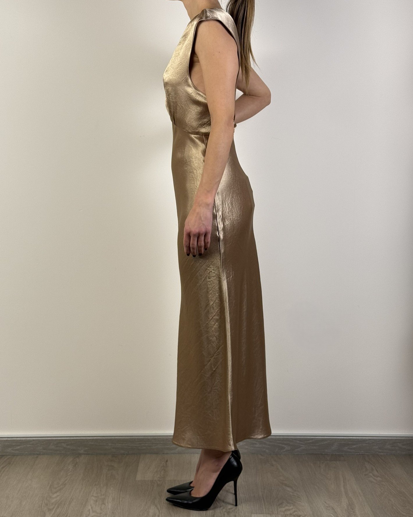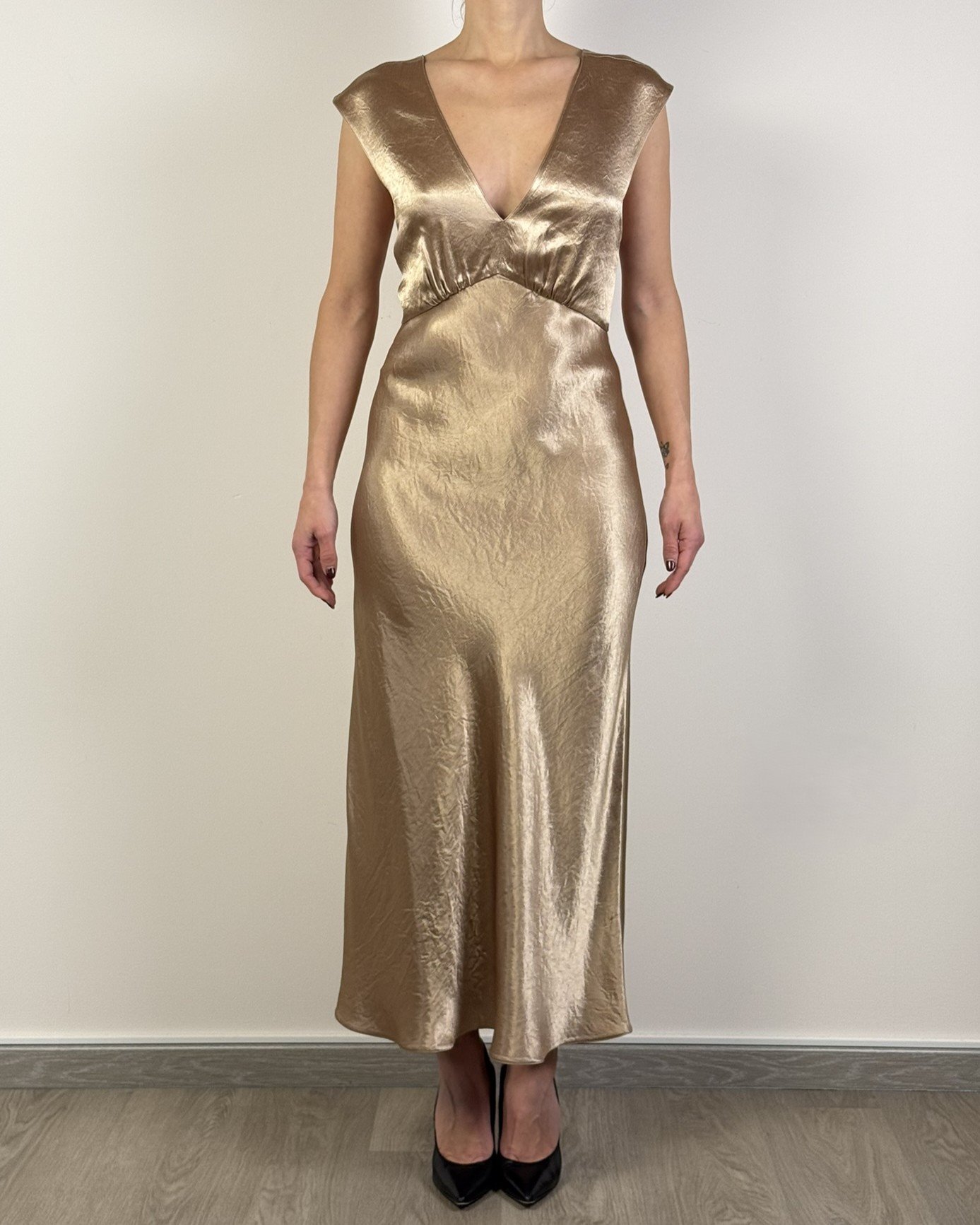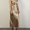 Abito lungo in raso con profondo scollo a “V” leggermente arricciato sul davanti, spalla larga che crea quasi una mezza manichetta che, sul retro, si incrocia in un profondo scollo a motivo. Sul retro scollo si chiude con una zip nascosta. Gonna lunga pencil non troppo voluminosa.