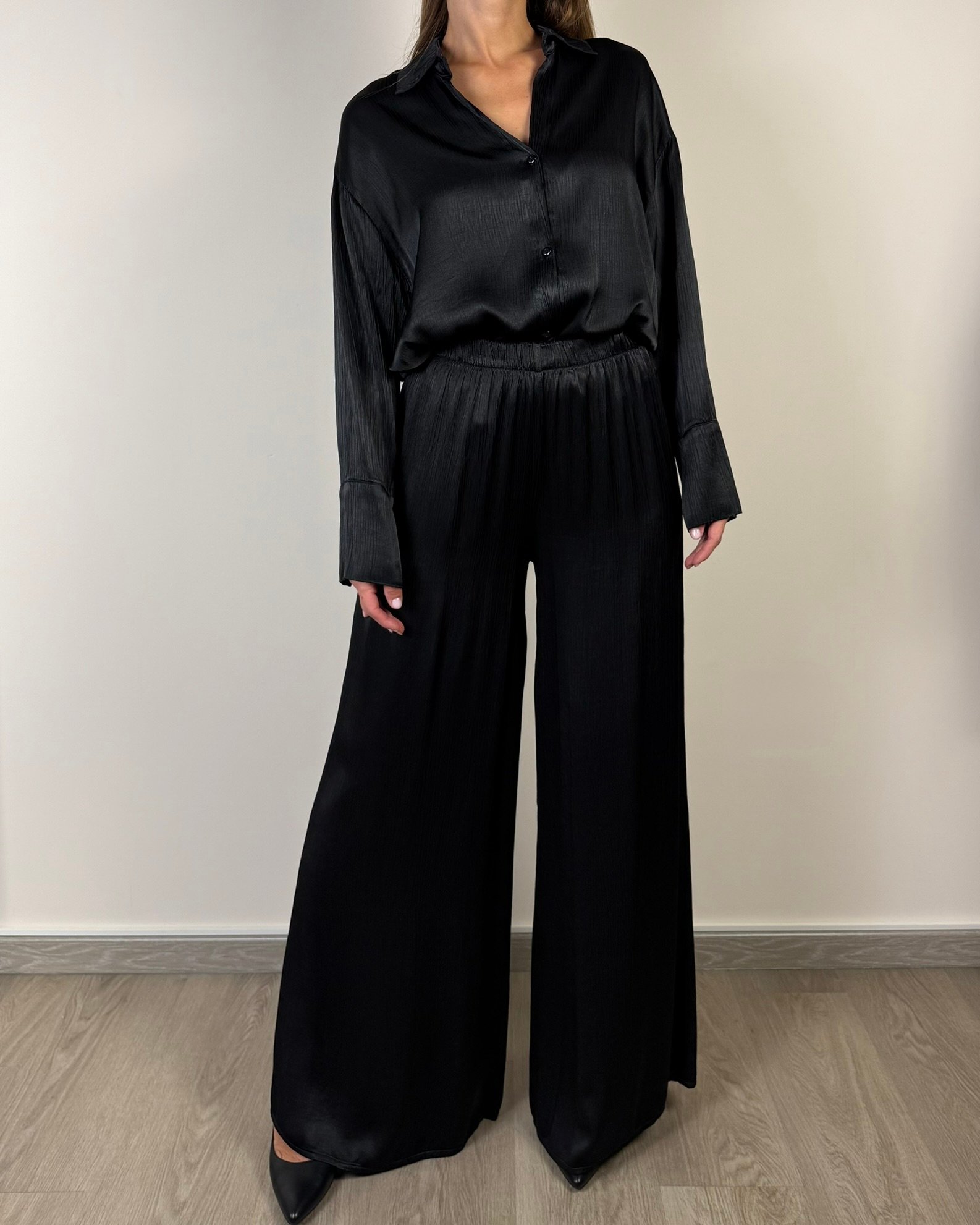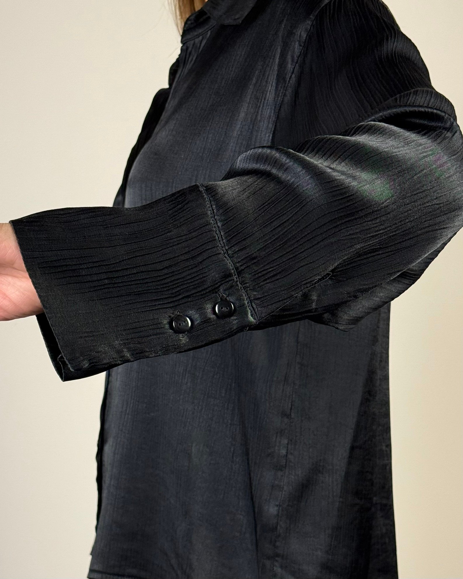 Camicia collo sciallato, chiusura bottoni in viscosa goffrata.