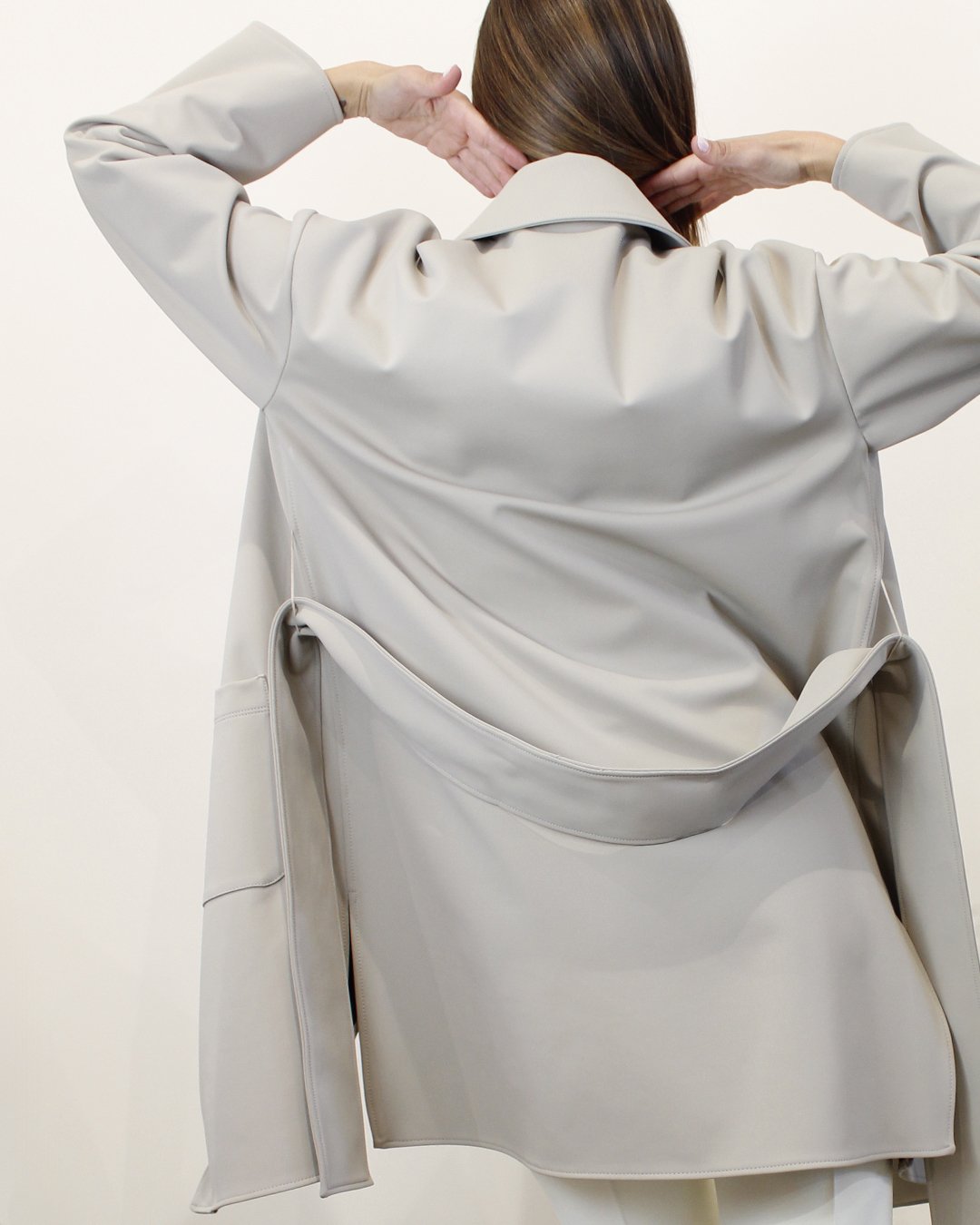 Spolverino realizzato in jersey tecnico accoppiato. Ha manica lunga con giro basso, tasche a toppa, spacchi nei fianchi, collo a camicia e abbottonatura nascosta sul davanti. Abbinata nello stesso tessuto una alta cintura per modulare la vestibilità .