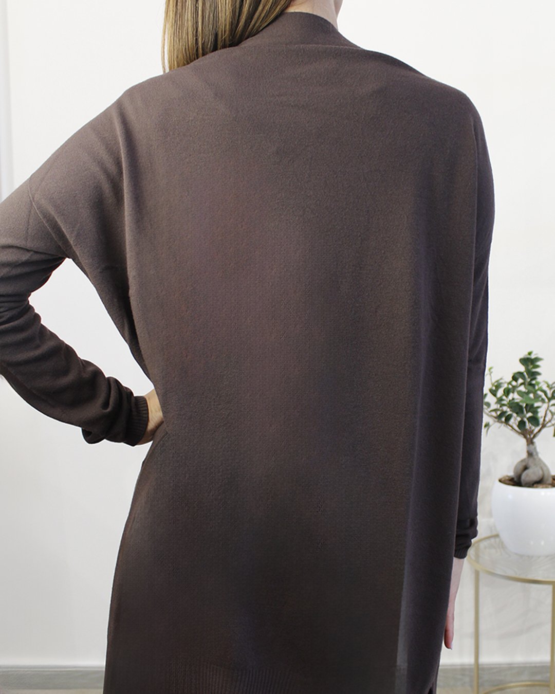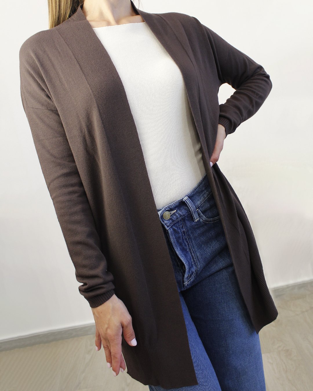 Cardigan lungo aperto senza bottoni.