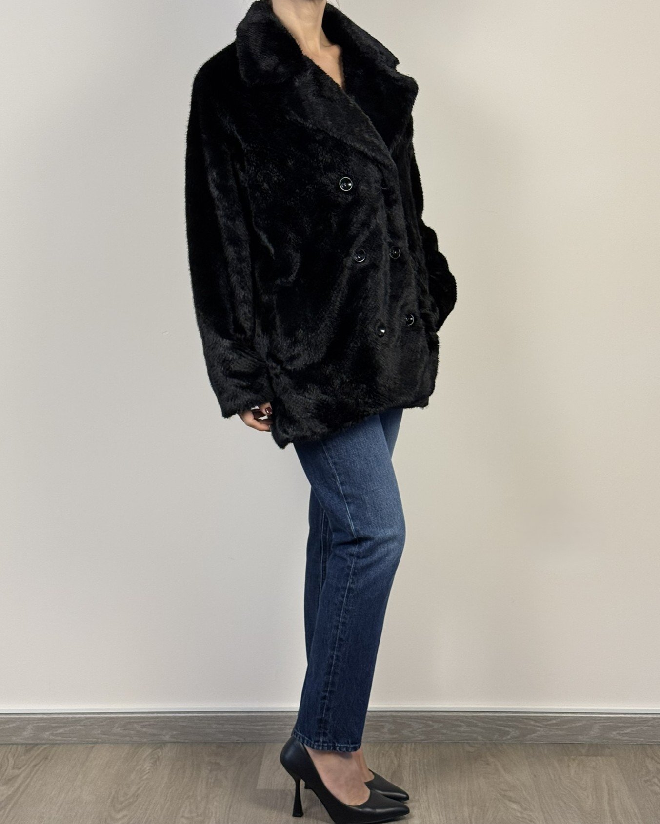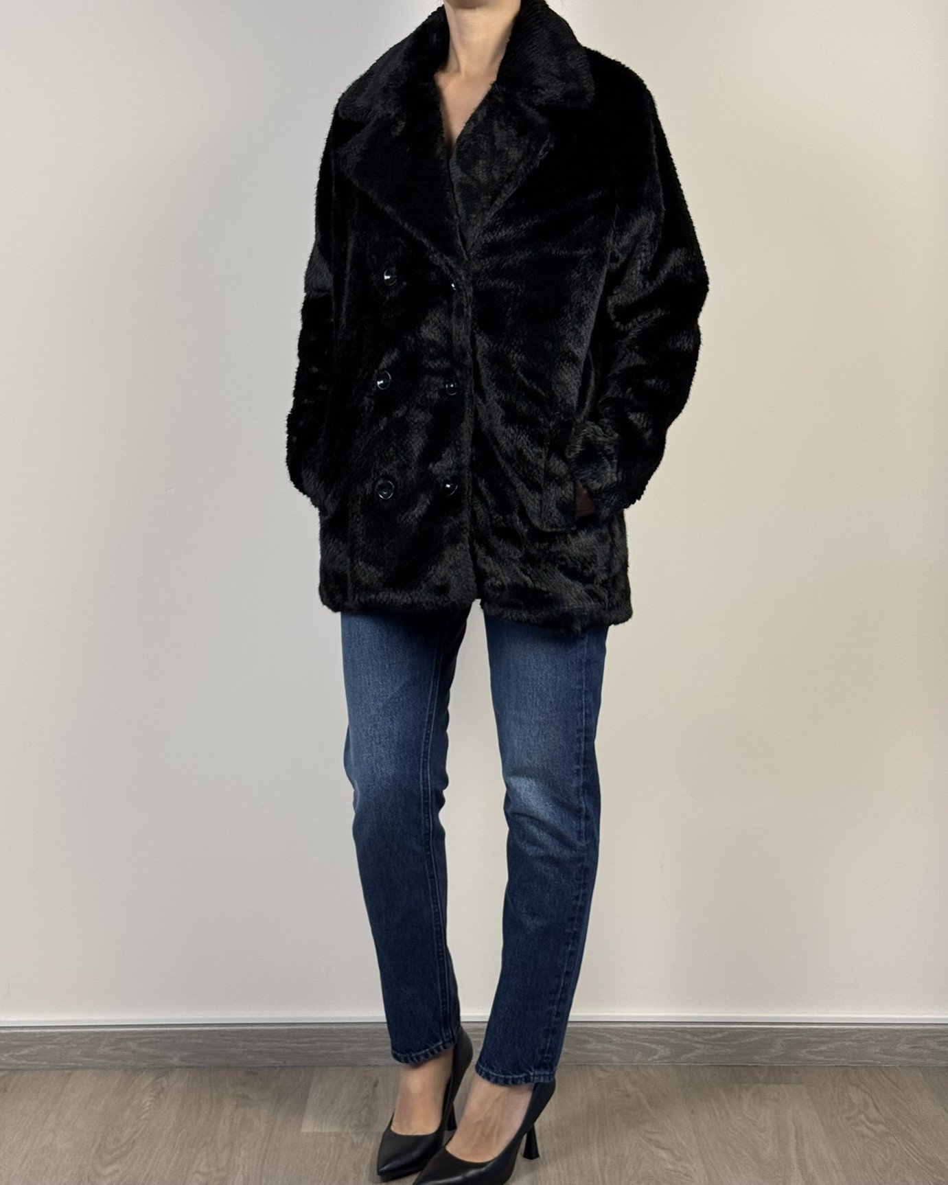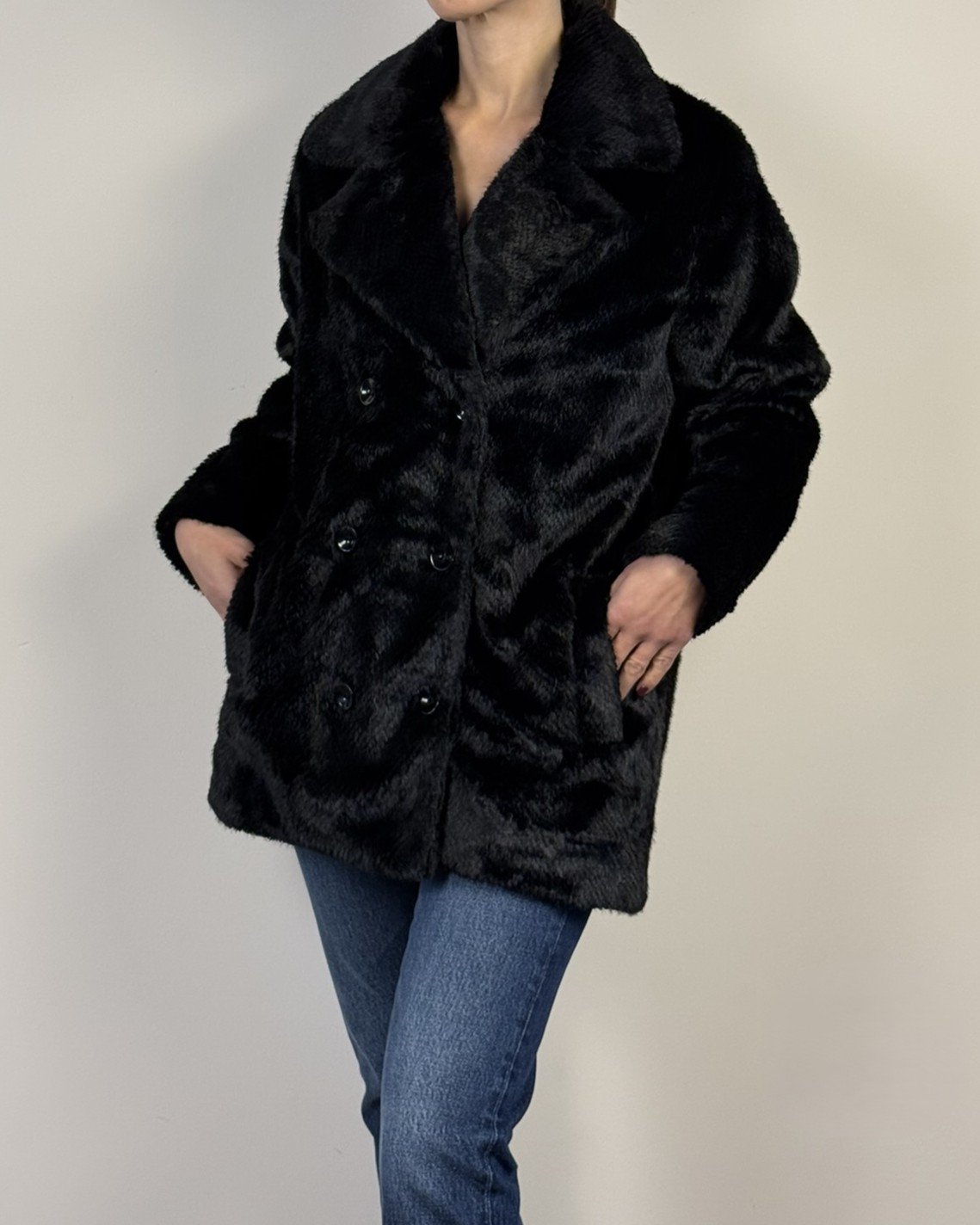 Ecopelliccia doppiopetto. vestibilità morbida regolare.