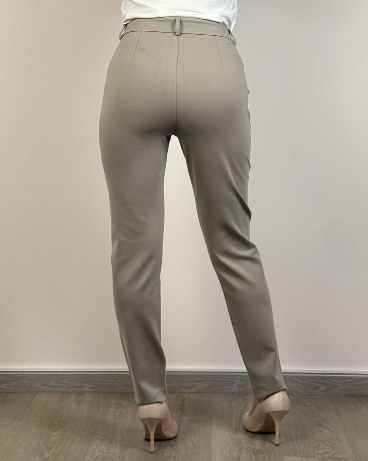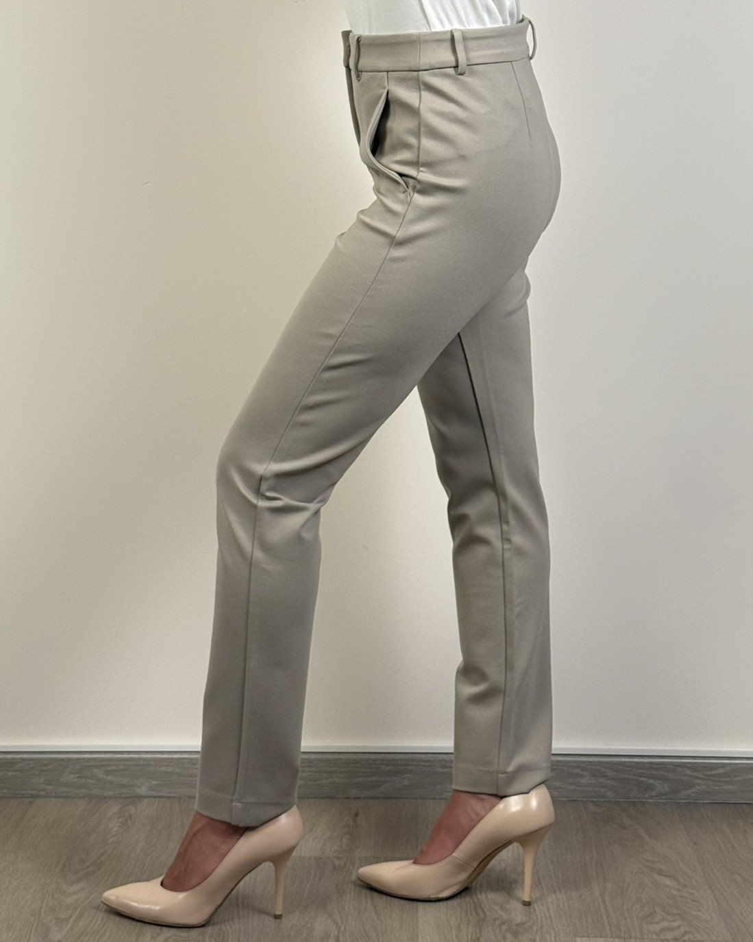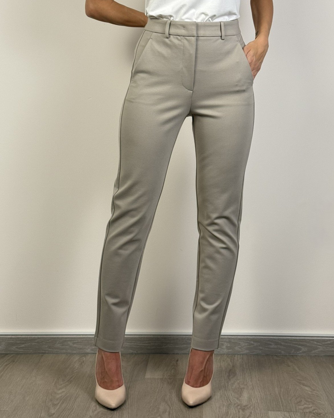 Pantalone in punto milano, tasche alla francese. Il modello ha gamba dritta con piega stirata davanti e dietro, e apertura con zip nascosta sul davanti.