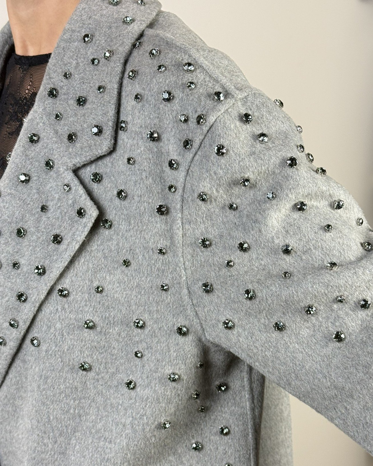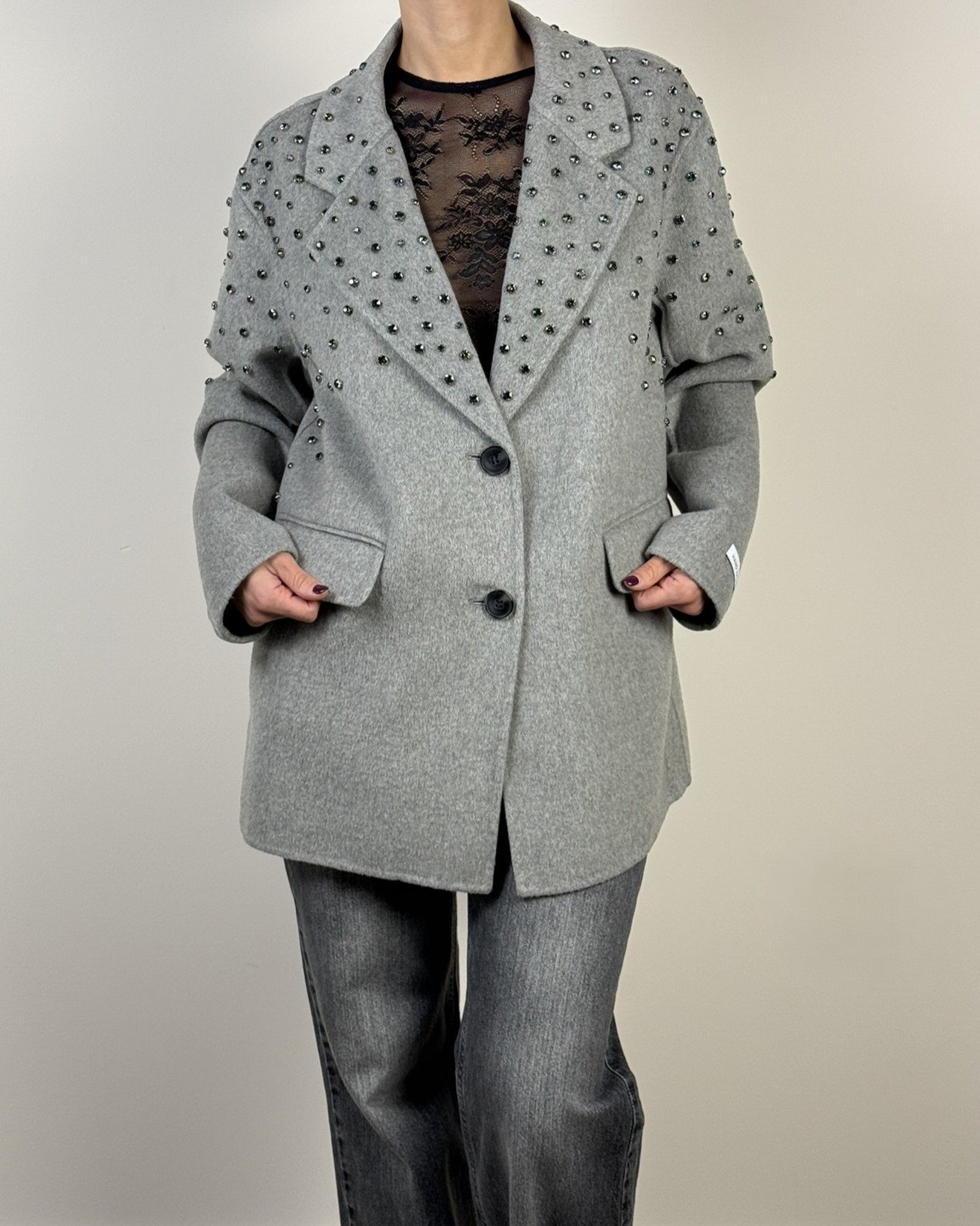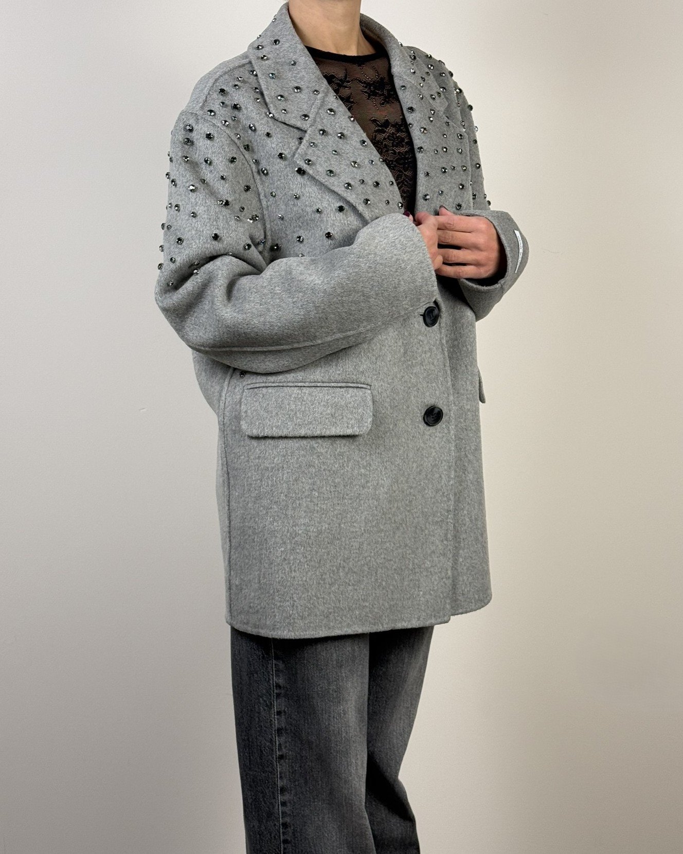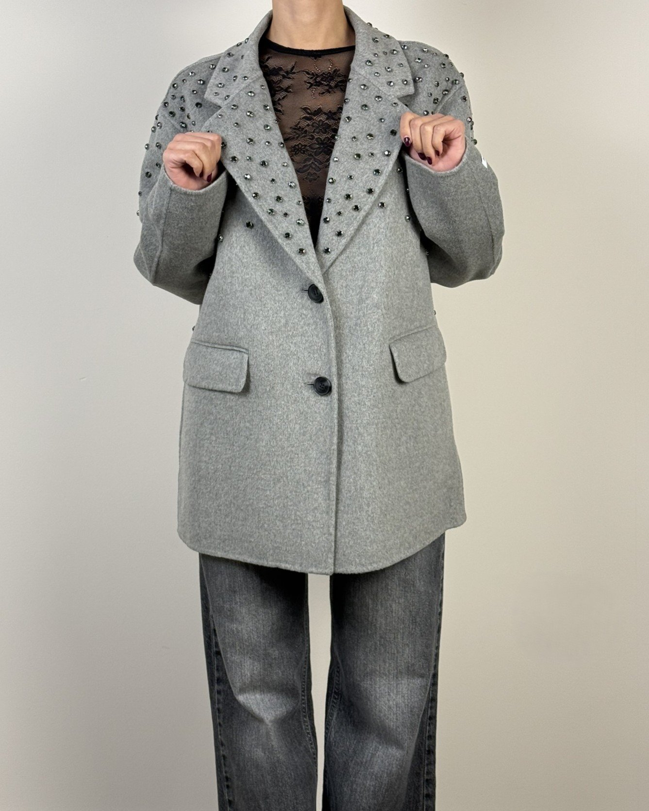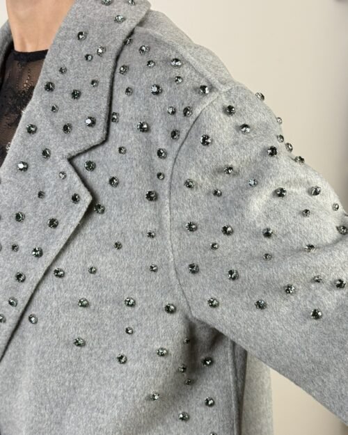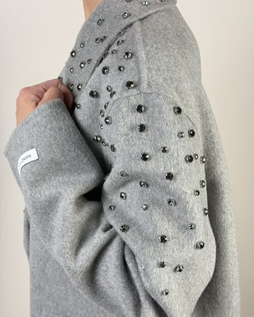 Cappotto handmade Haveone. Modello fit oversize collo revers e chiusura frontale a due bottoni. Con strass a cascata.