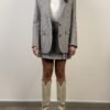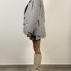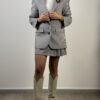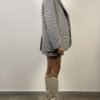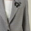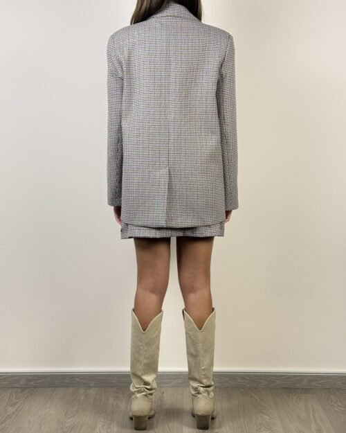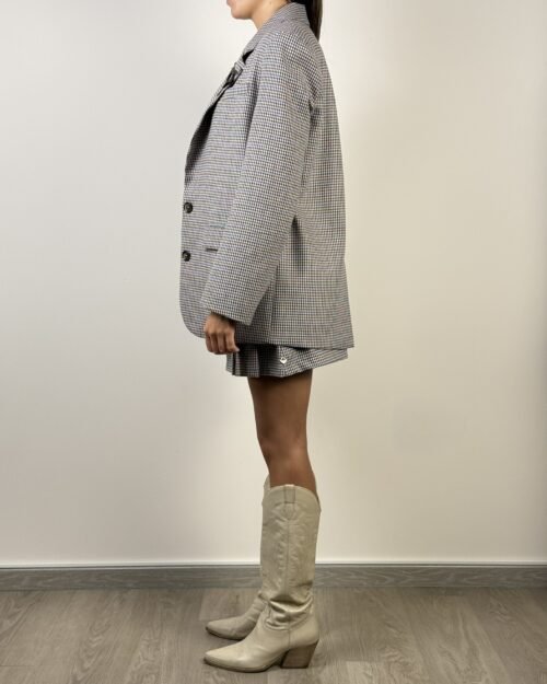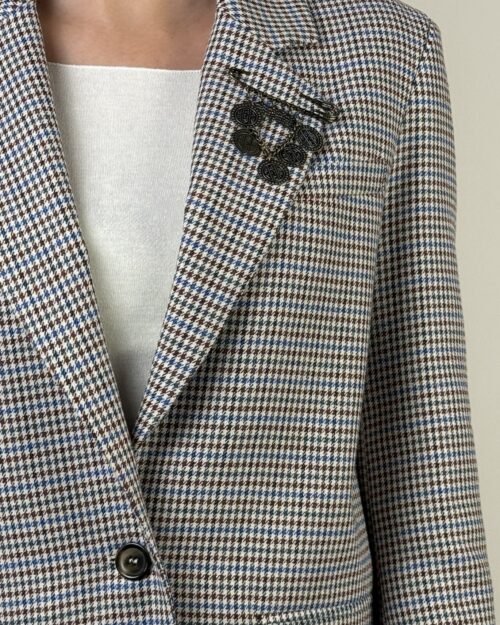 Giacca pied de poule beige, azzurro, vino, marrone e nero. Modello con chiusura frontale a due bottoni. Collo revers e tasche con patta. Dettaglio spilla con medaglioni.