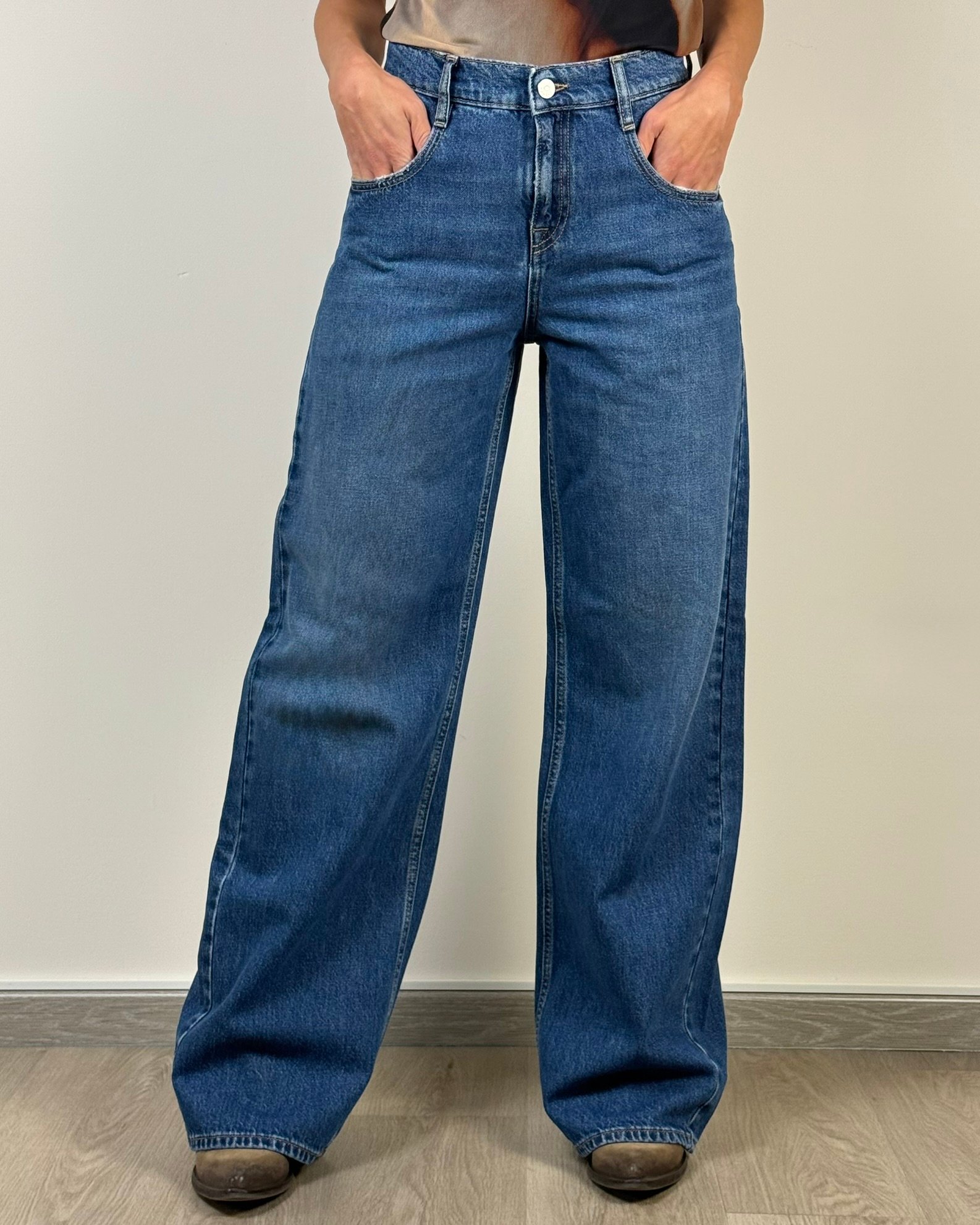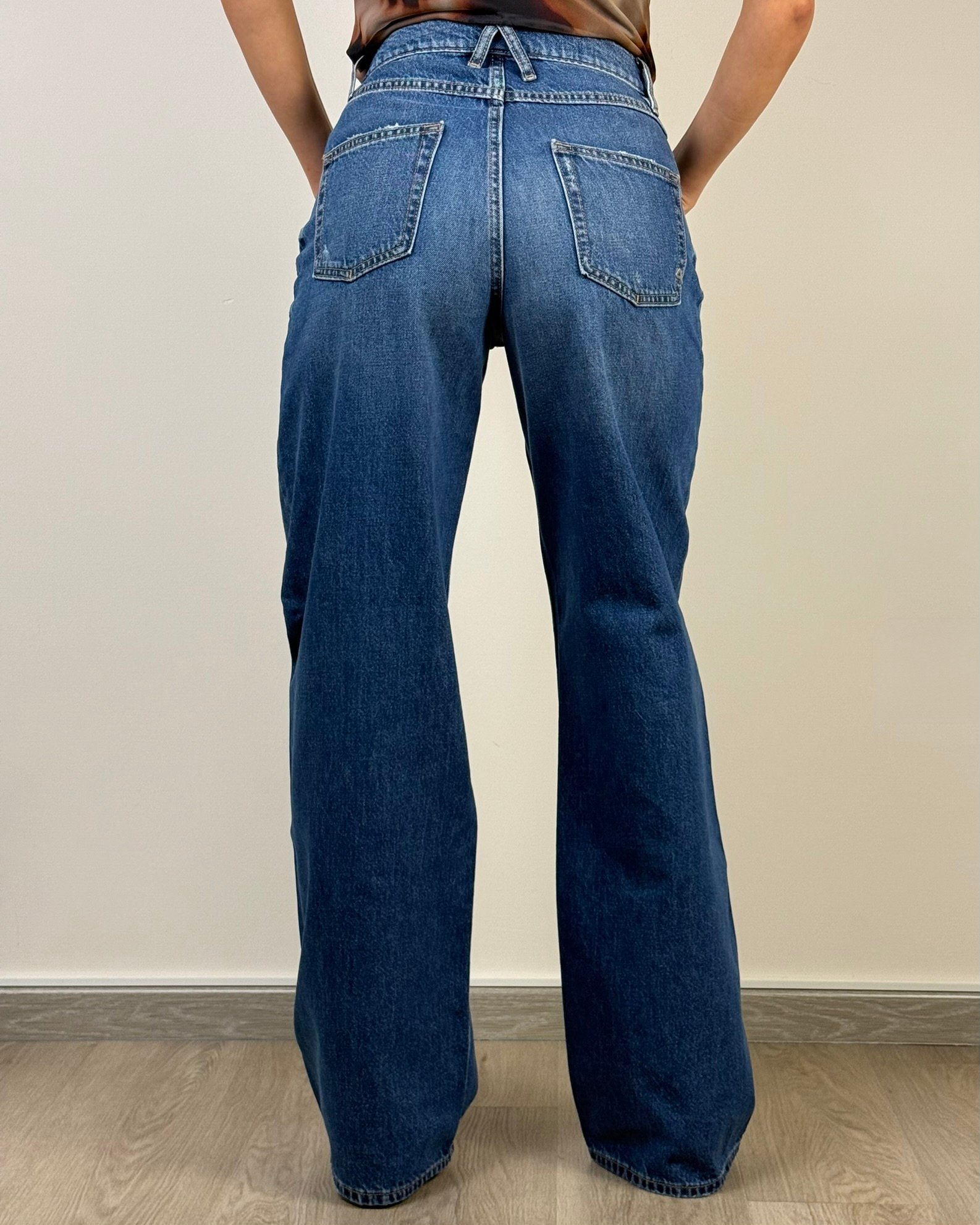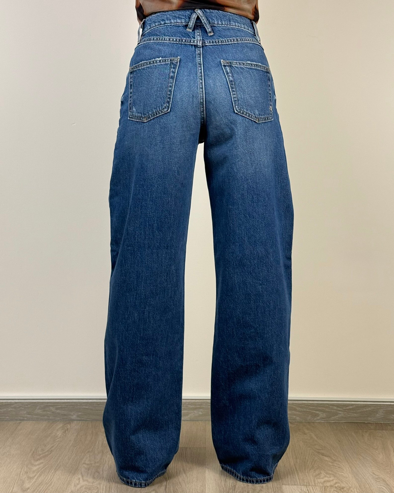 Jeans con vita bassa. Il modello a quattro tasche è caratterizzato da un design audace e innovativo, contraddistinto da una gamba molto ampia e dritta con cavallo sceso. Per questo capo dall’inconfondibile tonalità navy blue, realizzato in cotone parzialmente riciclato, il brand propone un lavaggio medio che crea sulla tela rigida un accattivante effetto vintage. L’impronta distintiva del brand è ben riconoscibile anche nei dettagli sul retro, dai passanti incrociati che formano il logo Cycle al piccolo elemento placcato che richiama ancora una volta il logo.