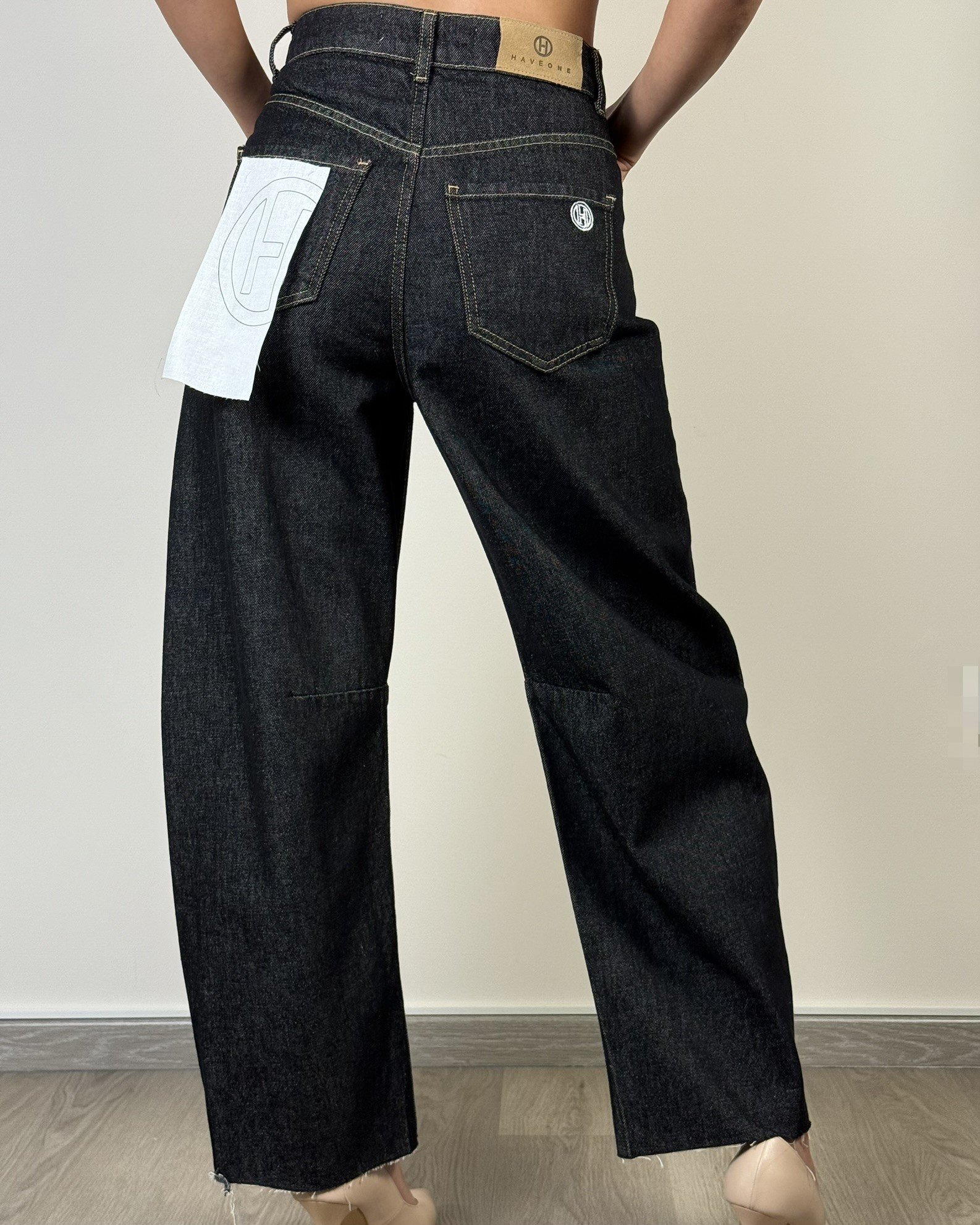 Jeans Barbara nero. Modello a vita alta, fit balloon con dettaglio di pinces all’altezza del ginocchio. Taglio vivo sul fondo. Chiusura con bottone e zip.