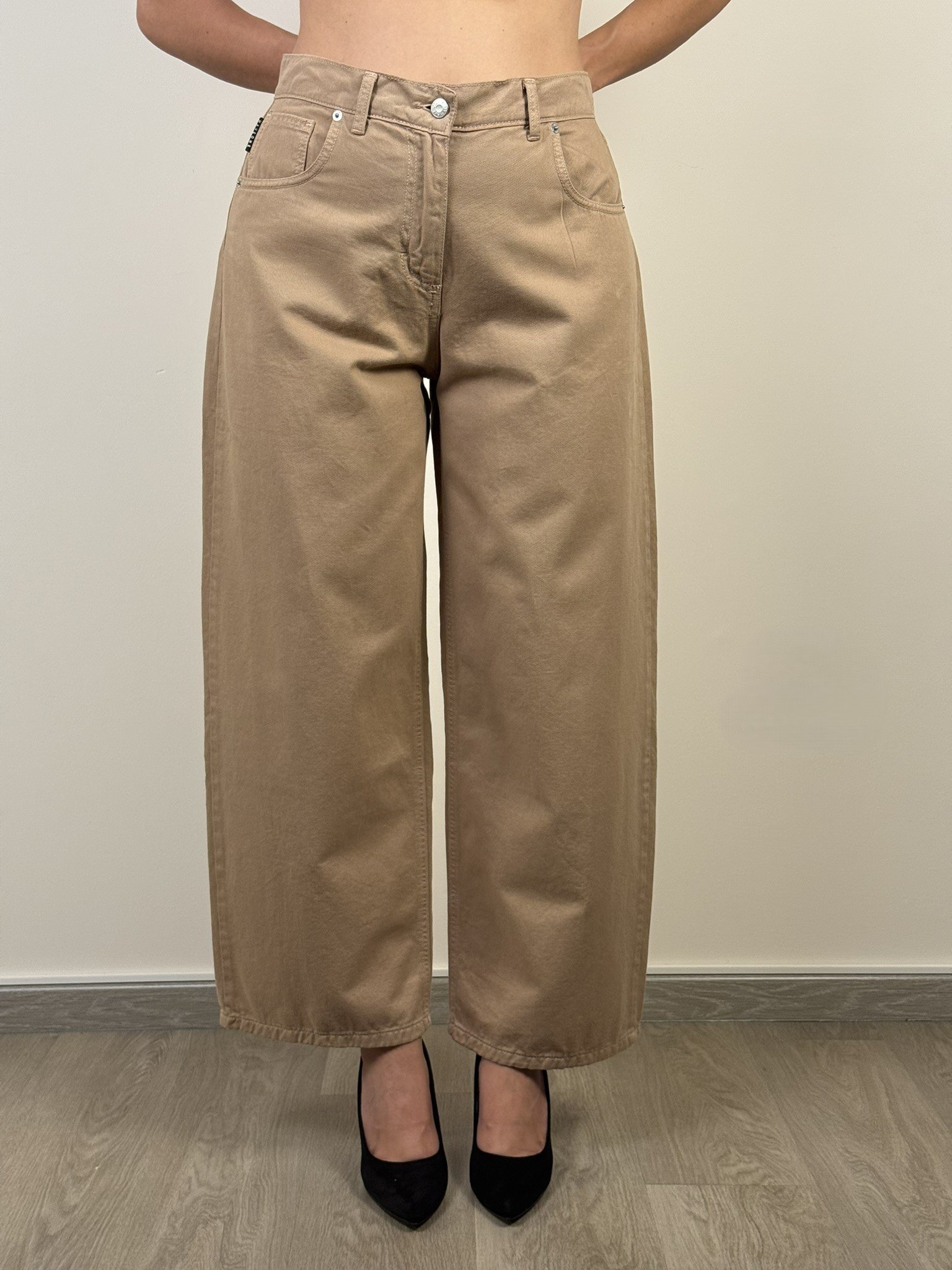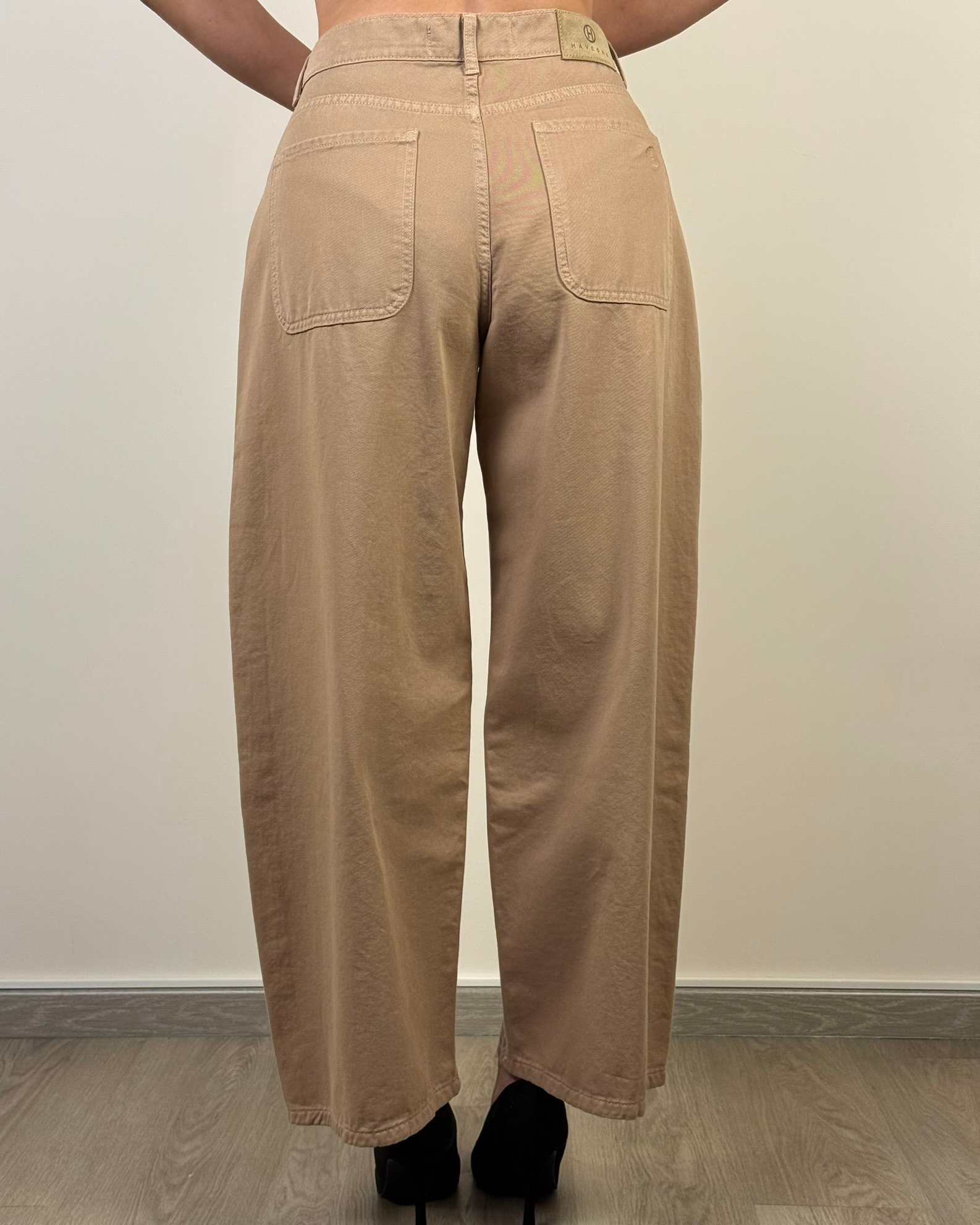 Jeans Bella in denim color Safari. Modello gamba ampia e vita regolare. Maxi tasche sul retro