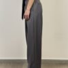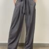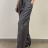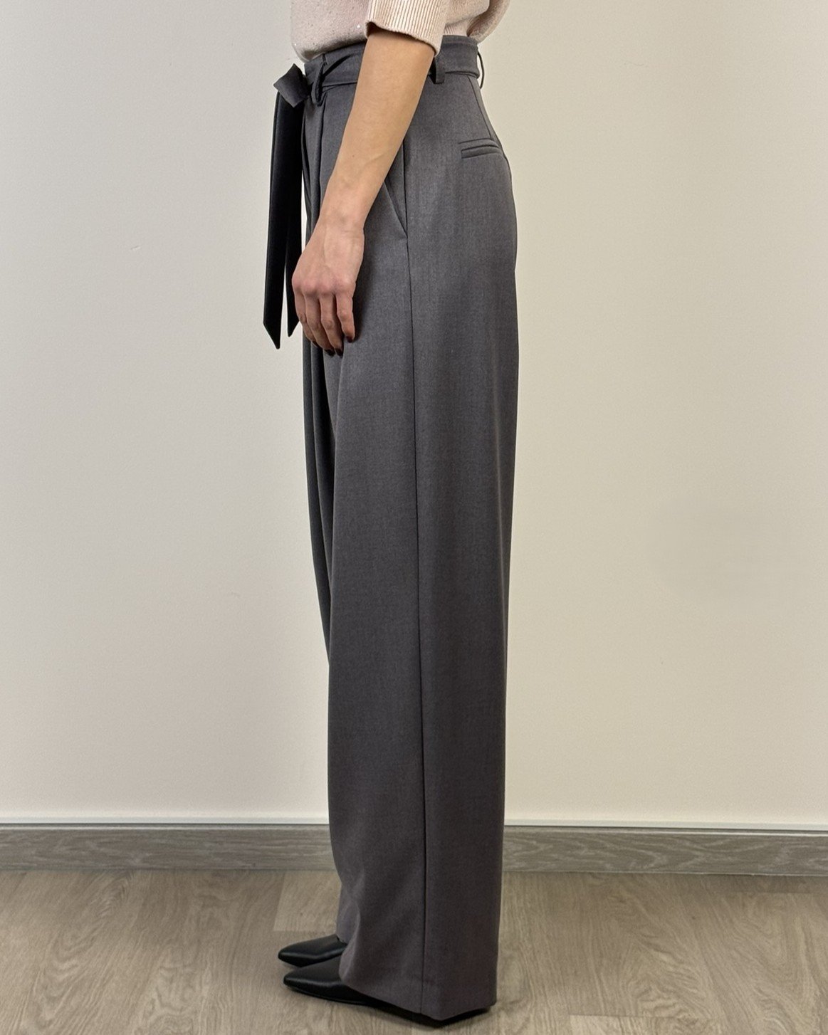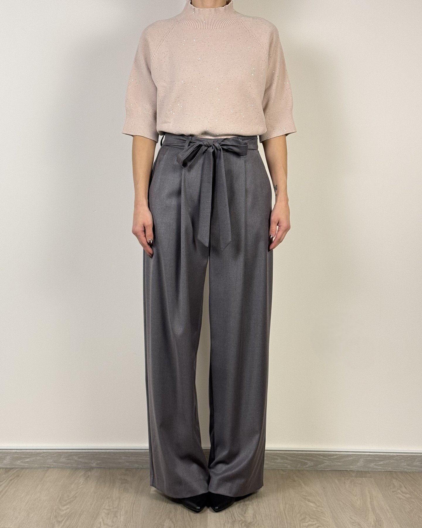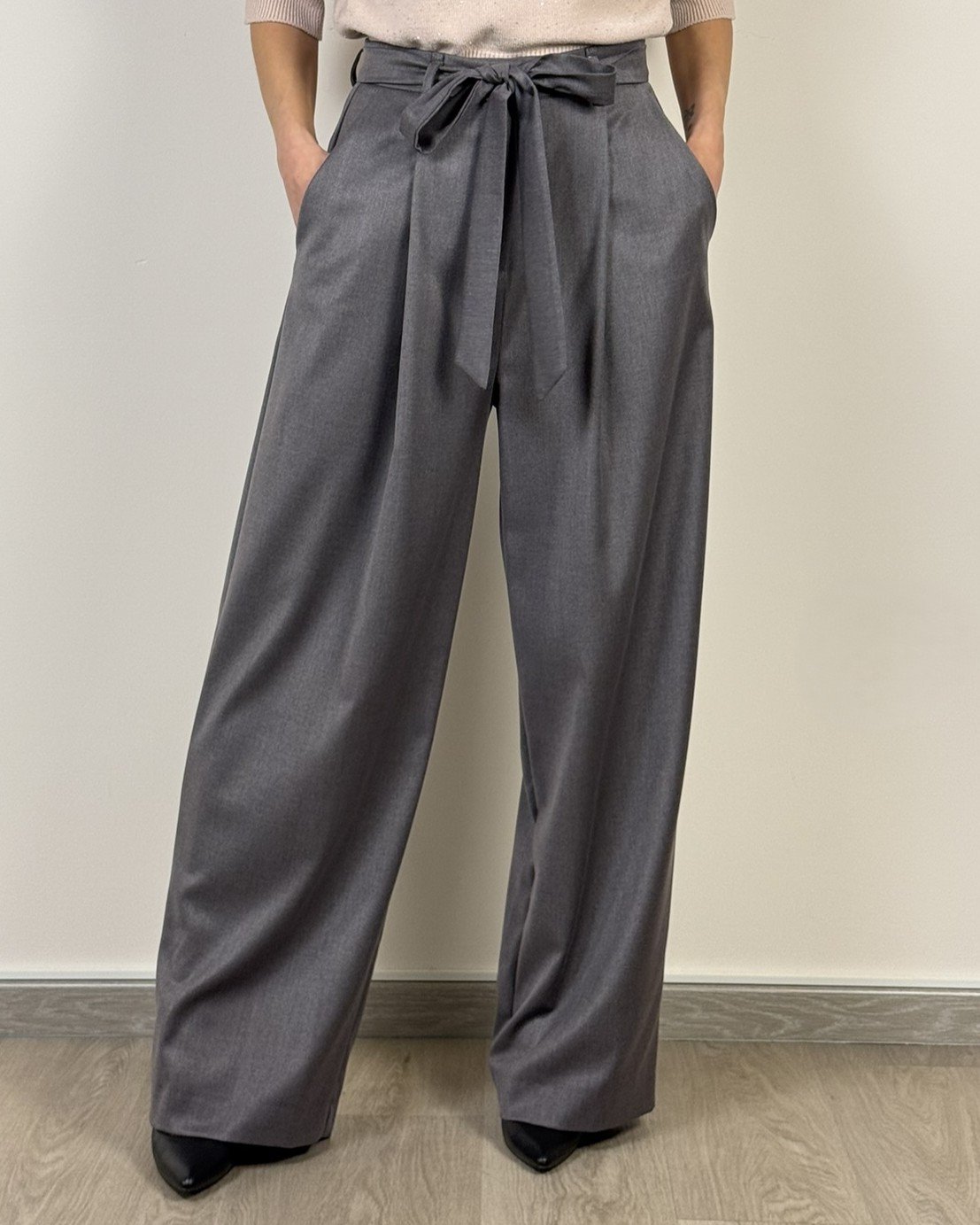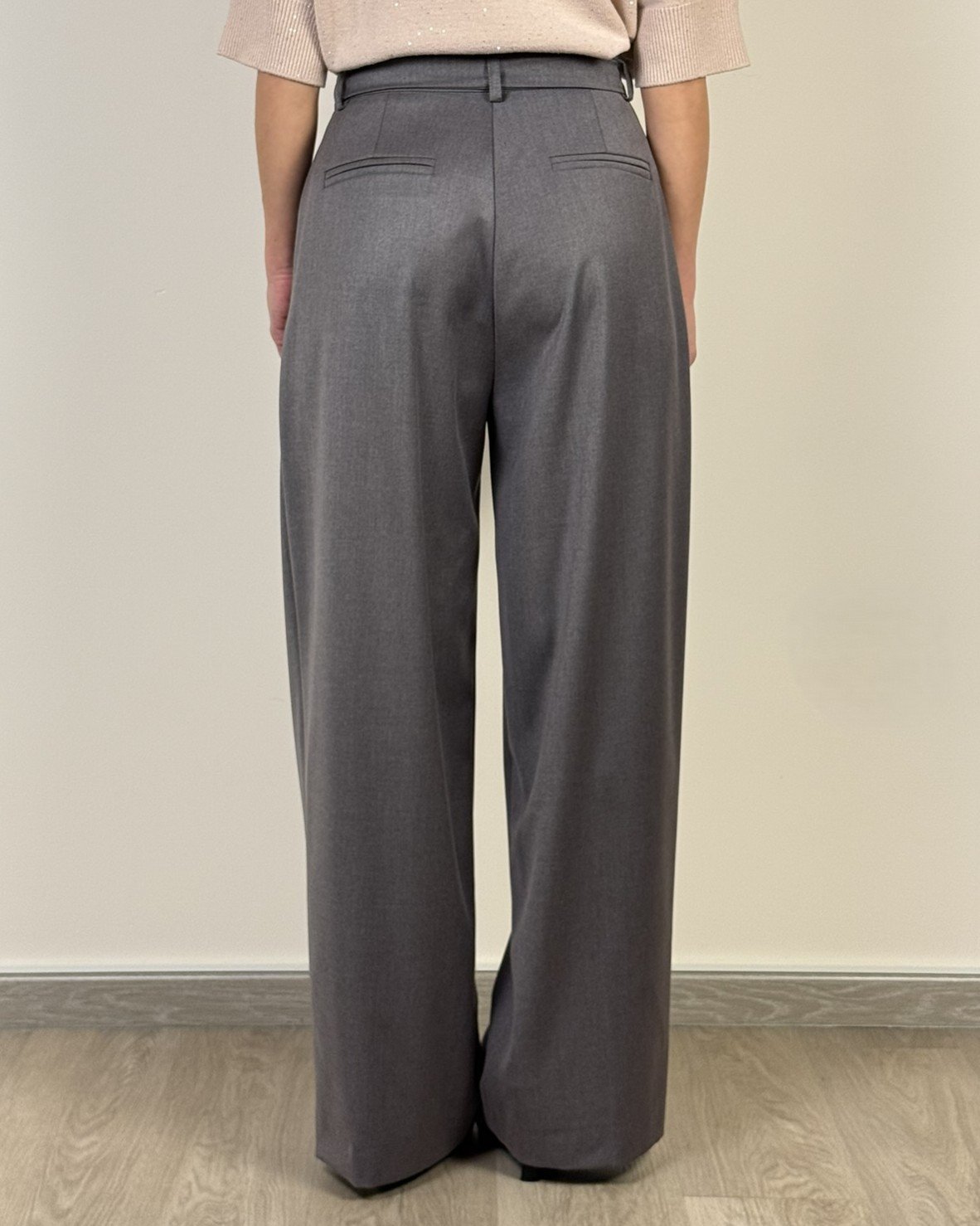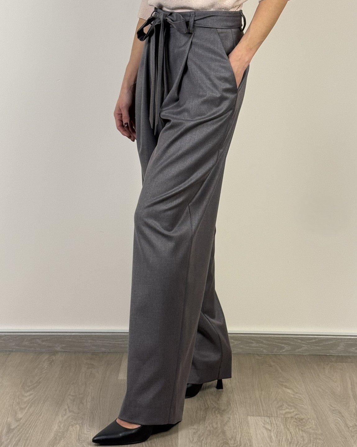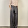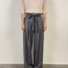 Pantalone Palazzo e pences sul davanti, con cintura in tessuto. Vita medio alta, tasche e chiusra a zip con bottone nascosta. Sul retro due tasche a filetto.