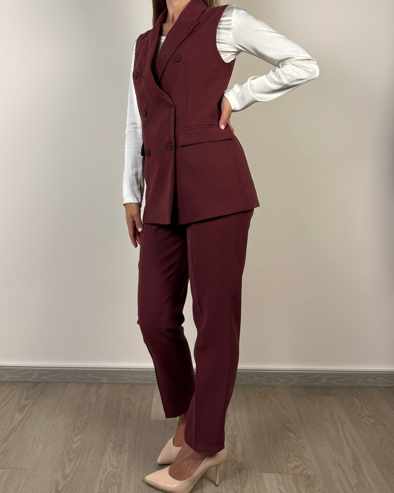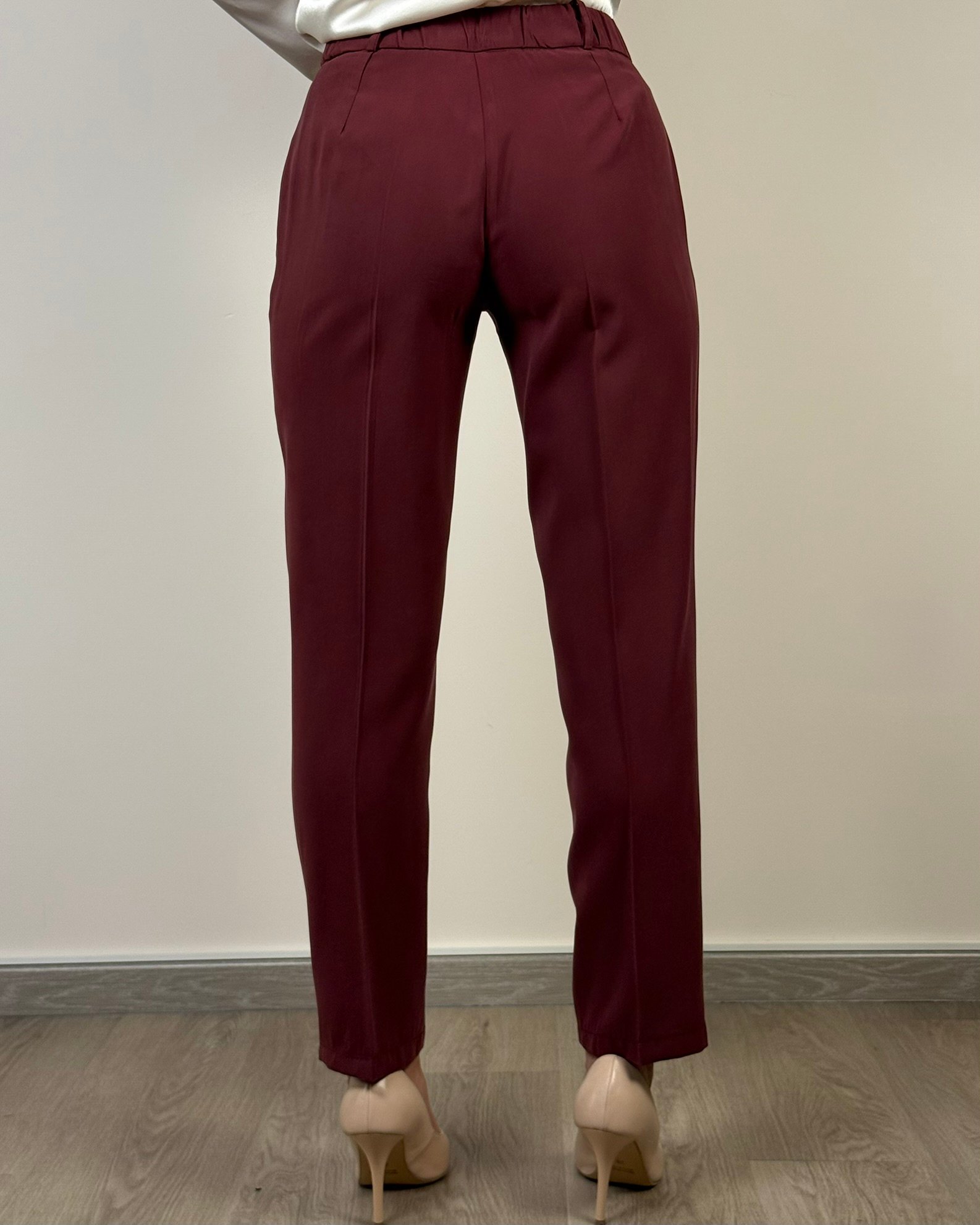 Pantalone sigaretta fit morbido, tasche alla francese, chiusura 1 bottone ed elastico dietro.