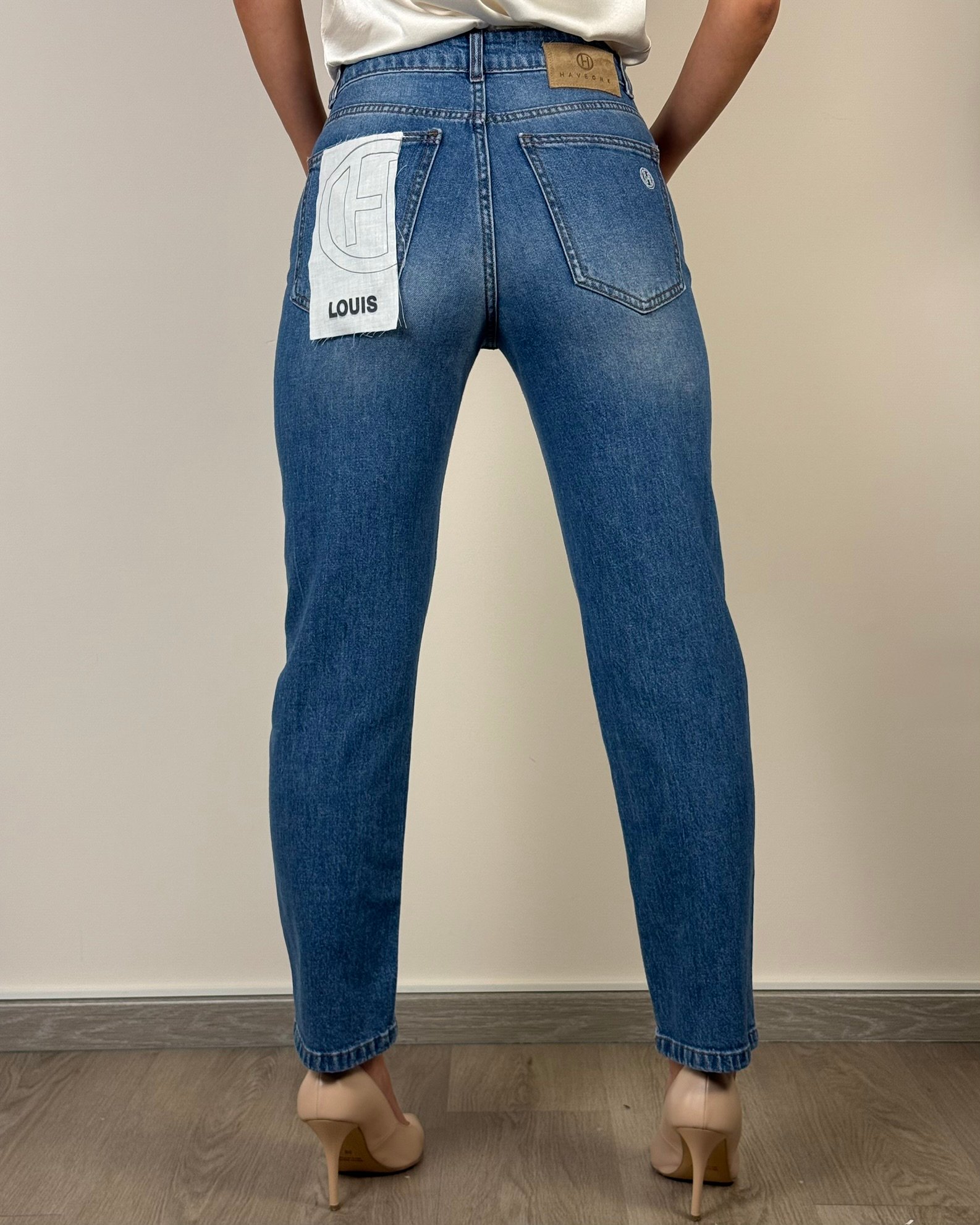 Modello a sigaretta morbido lavaggio medio, vita medio alta, cinque tasche e chiusura con zip e bottone. Fit regolare.