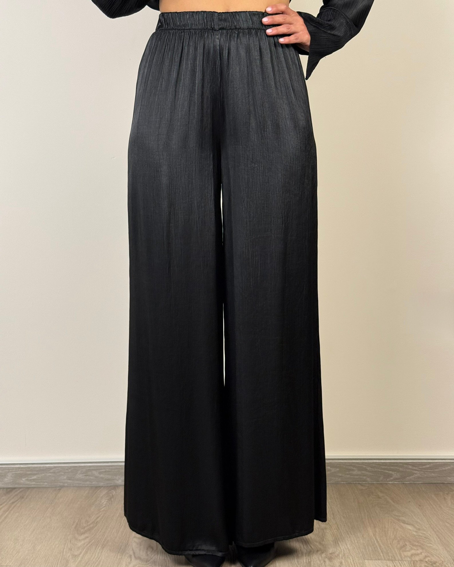 Pantalone viscosa ampio, elastico in vita, tessuto goffrato.