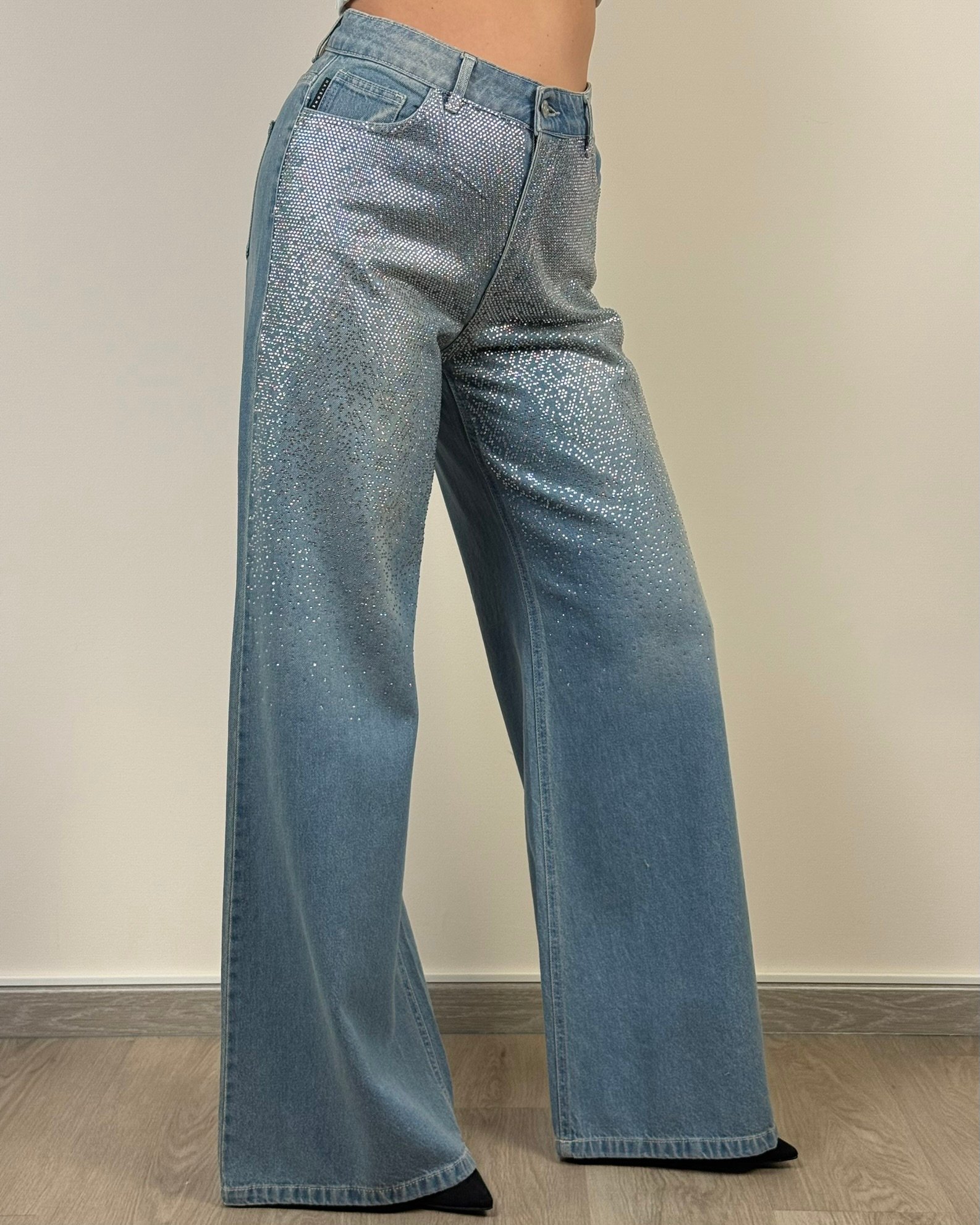 Jeans denim lavaggio medio. Modello vita alta gamba morbida con dettaglio di cascata strass.