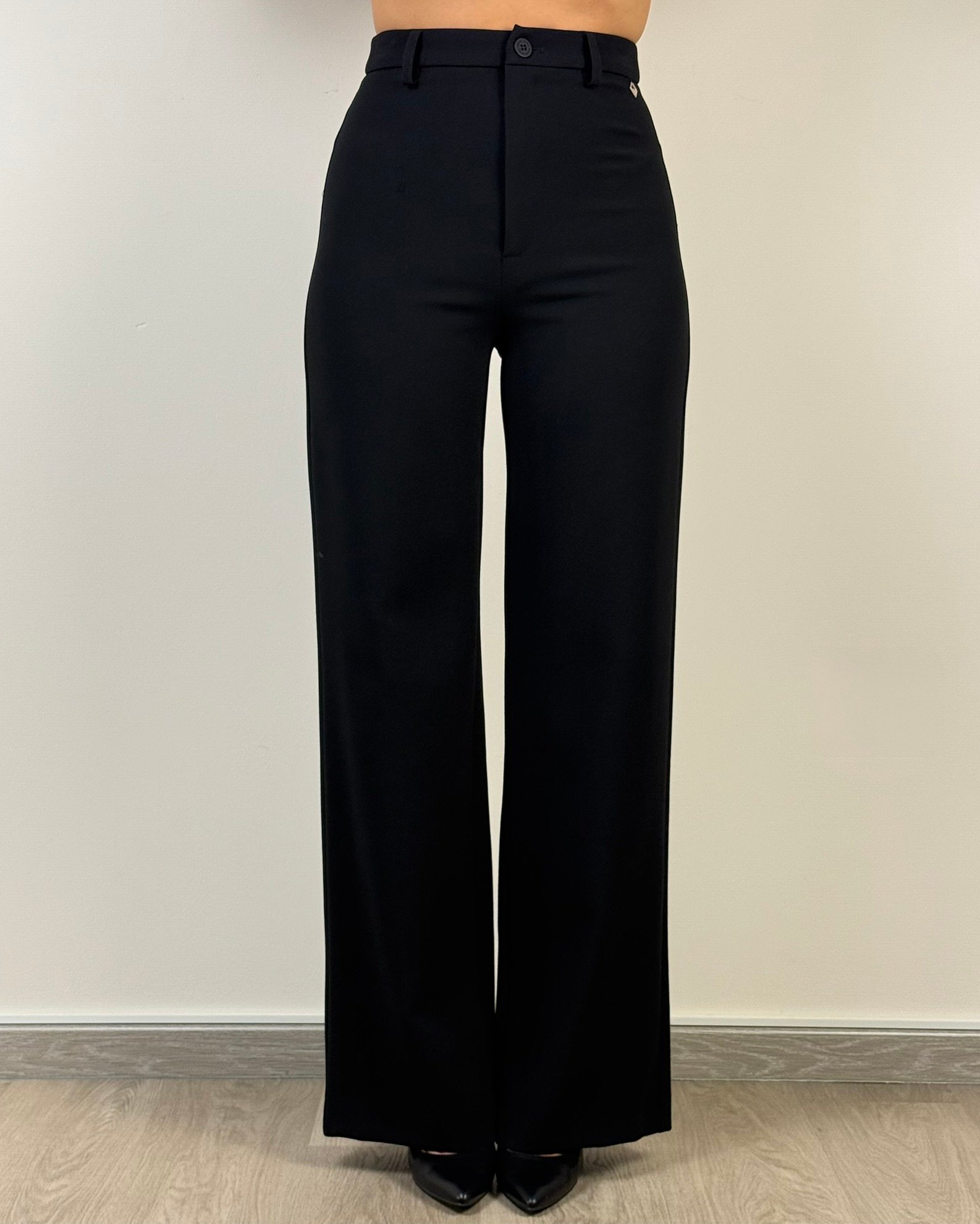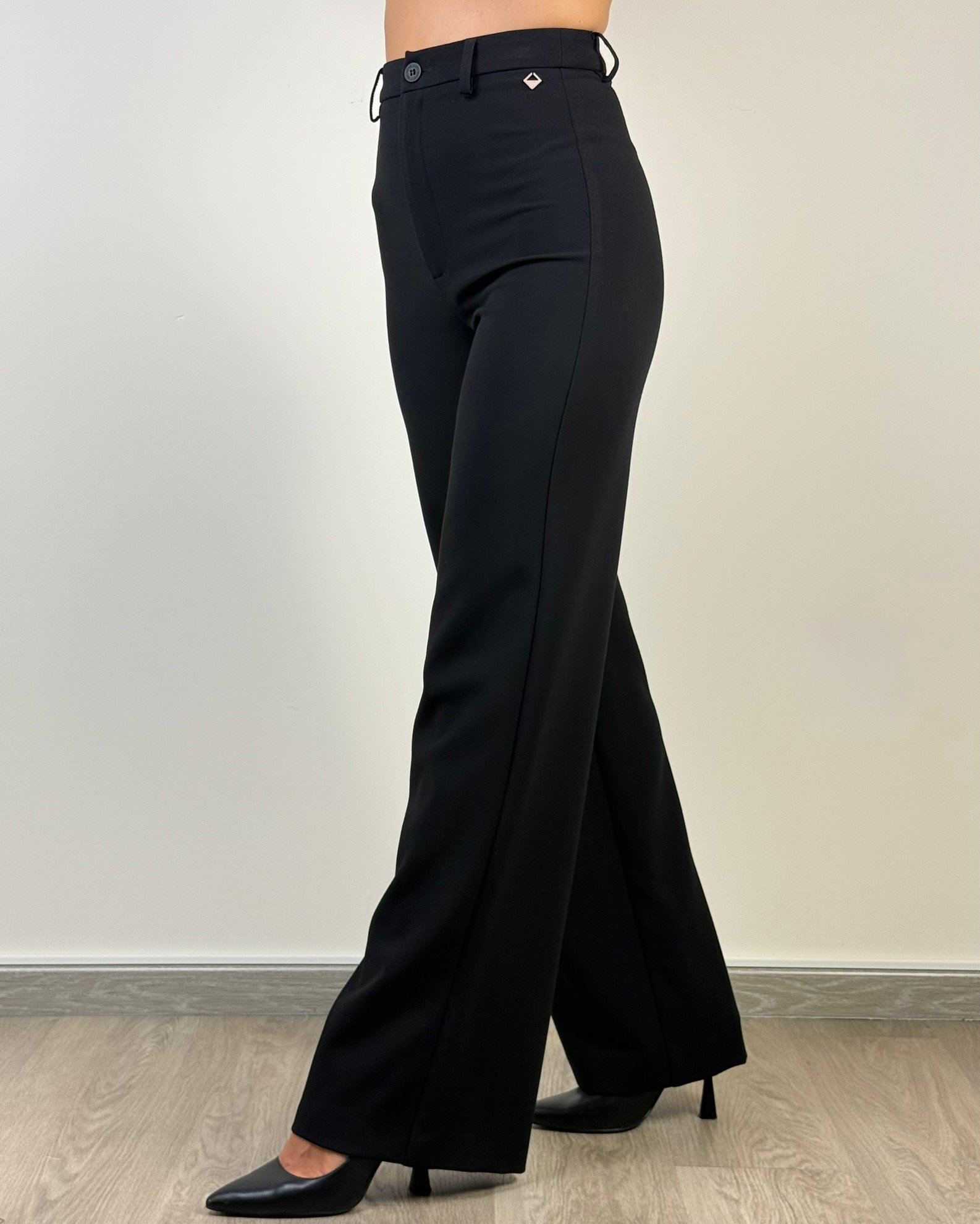 Pantalone palazzo a vita alta, con chiusura ad un bottone e passanti per cintura.