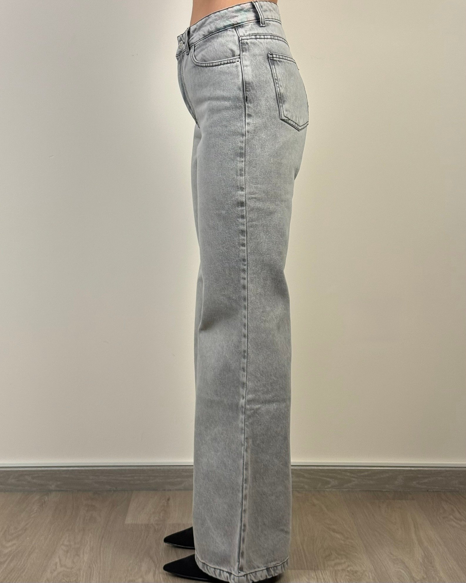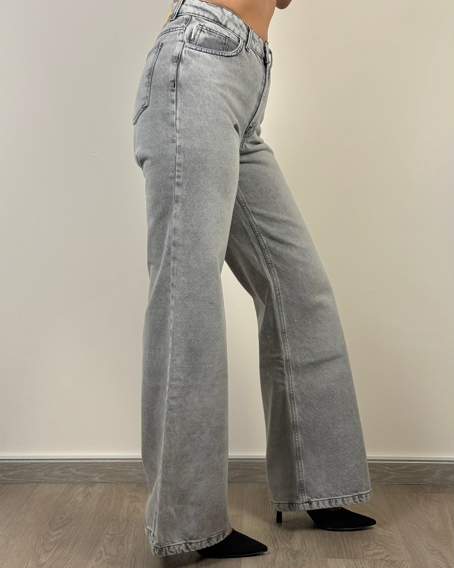 Jeans Tokyo lavaggio grigio, Modello a palazzo con vita alta, svasato sul fondo. Tasche laterali e sul retro. Chiusura con zip e Bottone.