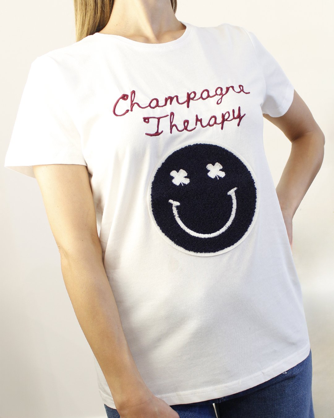 T-shirt a girocollo ricamo scritta e smile a rilievo.