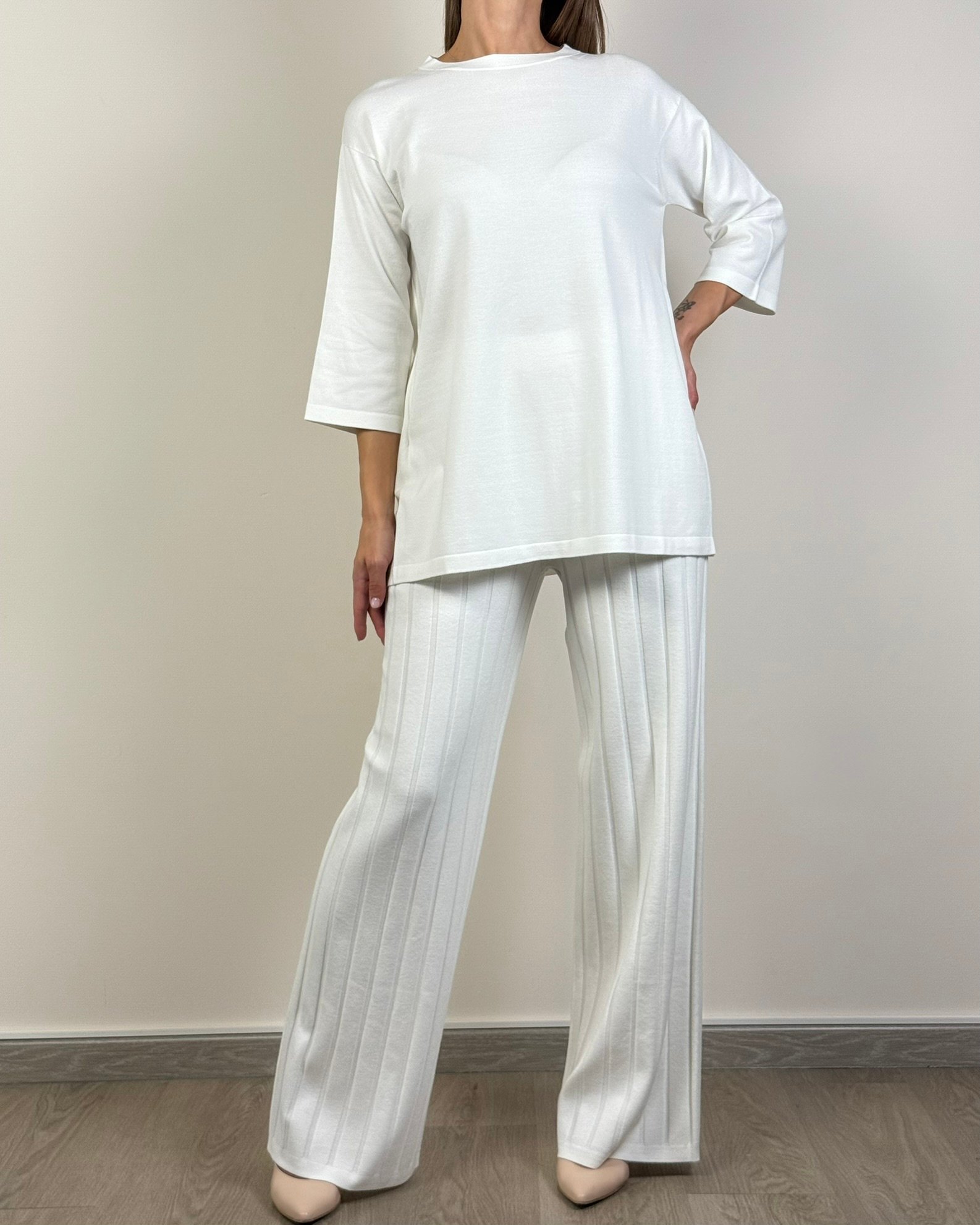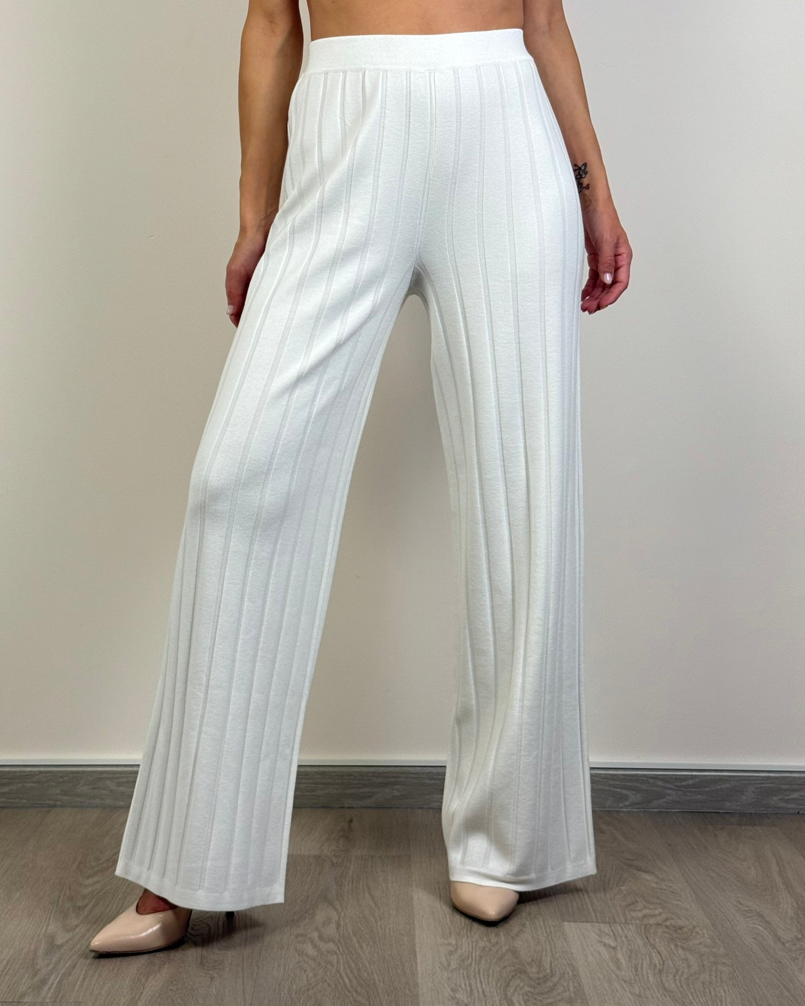 Pantaloni realizzati in filato di viscosa stretch con cintone elastico in vita. Rifiniti con lavorazione a coste che dona tridimensionalità alla silhouette. Filato di viscosa stretch. Linea dritta