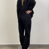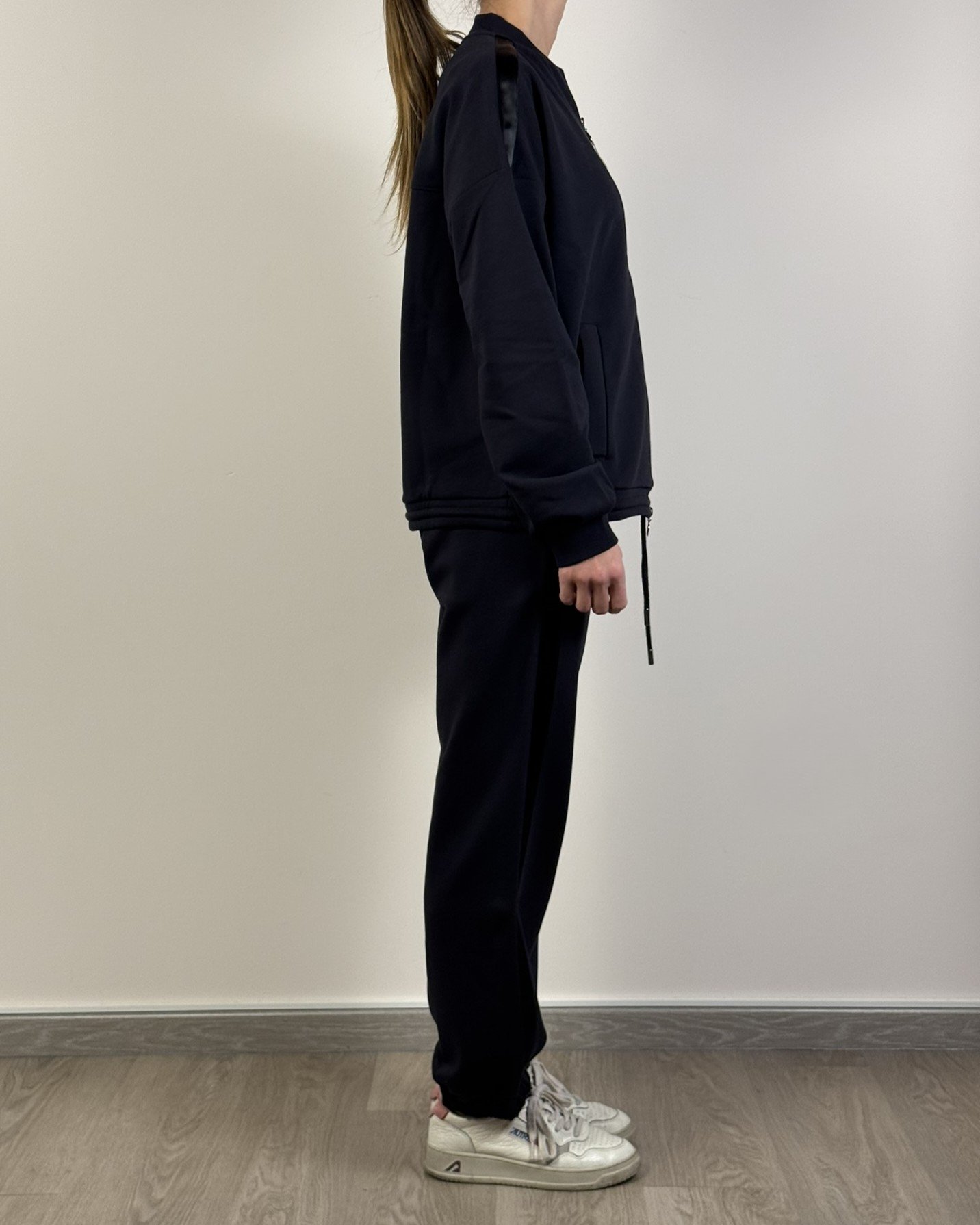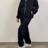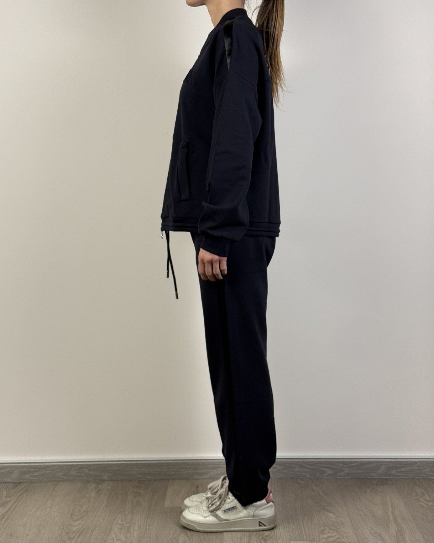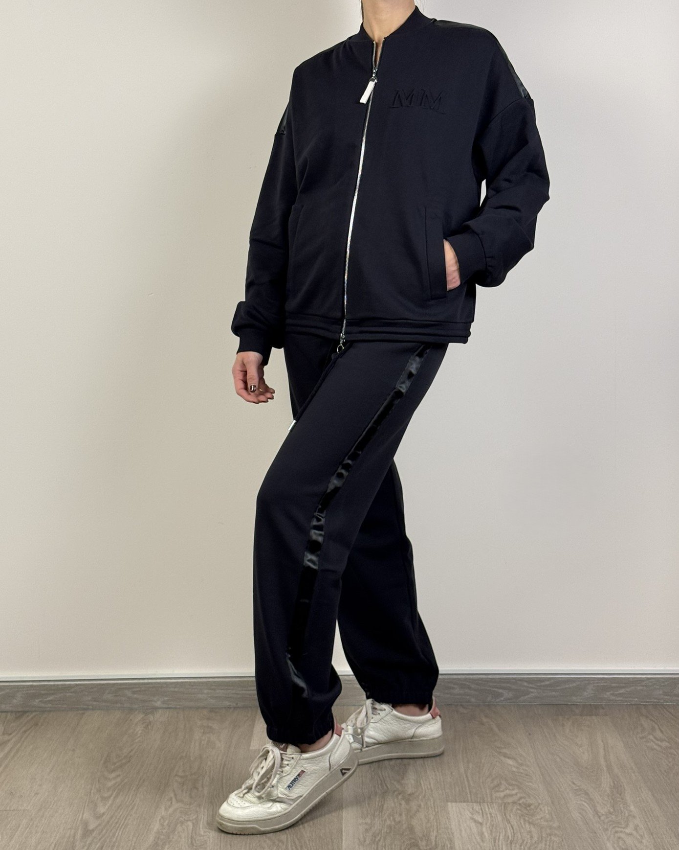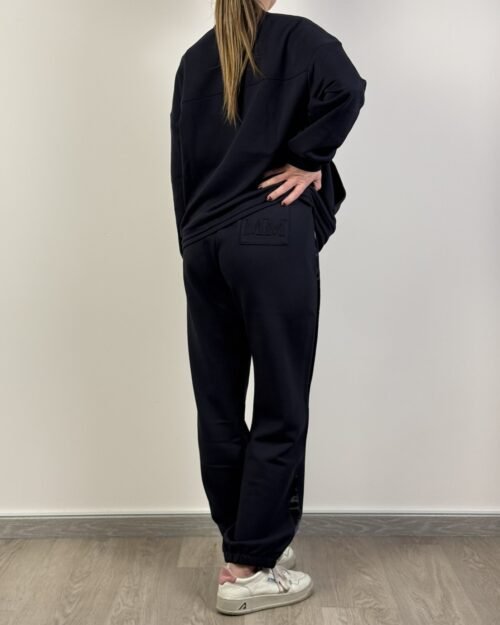 La felpa di Max Mara presenta chiusura con zip frontale in acciaio, logo brand sul petto, tasche frontali, collo e maniche a costine , fascia in raso sulle spalle. Dalla mano morbida dovuta alla composizione in 54% cotone, 44% poliestere e 2% elastan. Pantalone leggermente aderenti nella zona dei fianchi, banda raso laterale, Due tasche laterali a taglio e taschina dietro logata, elastico coulisse in vita e in fondo.