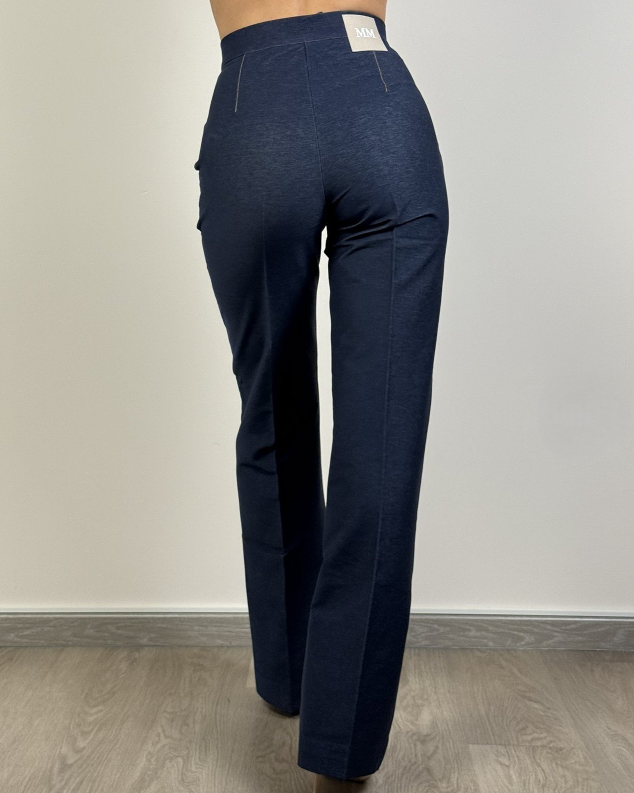 Pantaloni realizzati in jersey con texture effetto denim. Il capo ha vita con fit confortevole sul bacino e tasche alla francese. Le pieghe stirate al centro gamba esaltano la linea dritta del capo, che si apre con volume al fondo. Chiusura con zip nascosta sul davanti. Linea dritta. 57% Cotone, 32% Poliestere, 11% Elastan