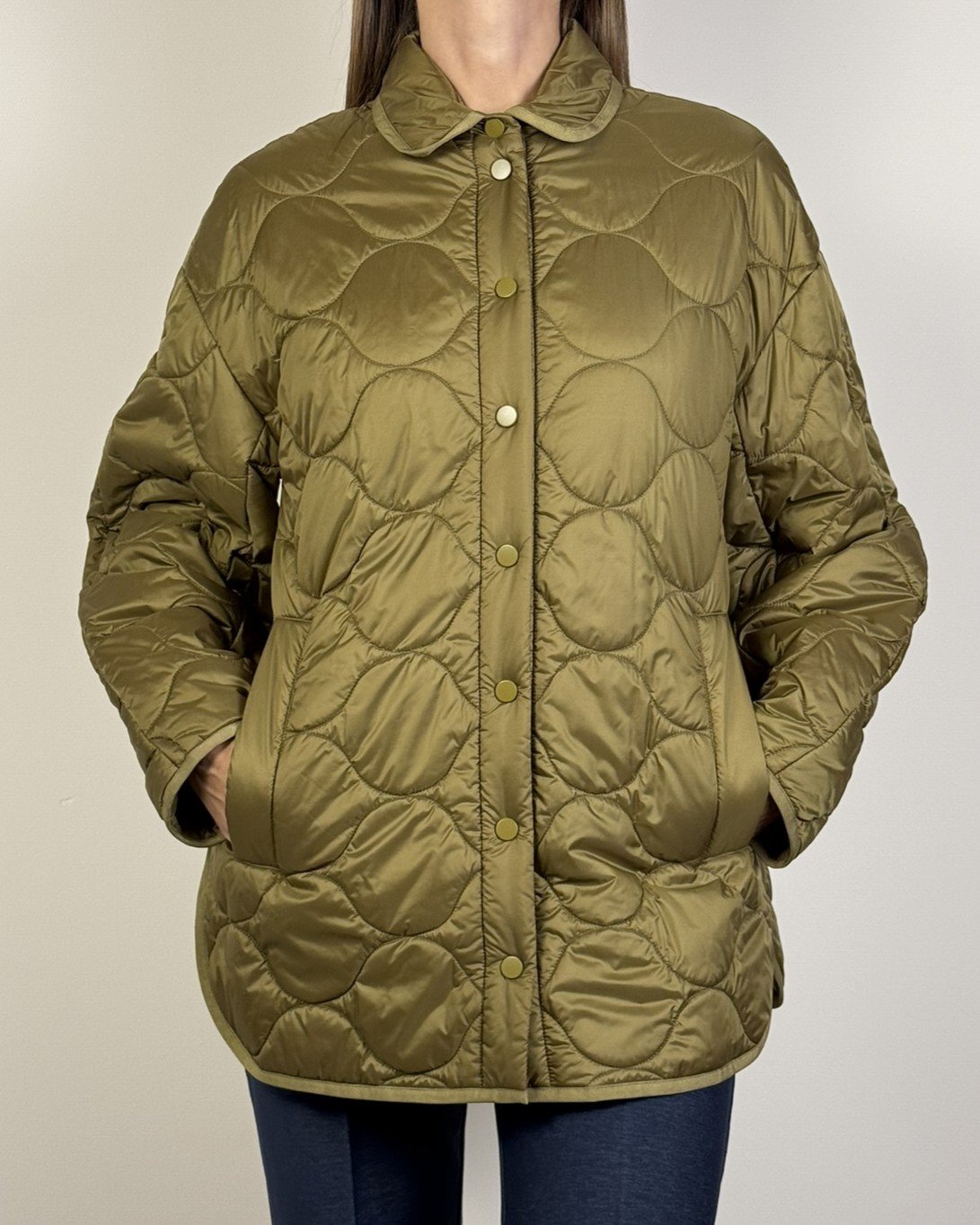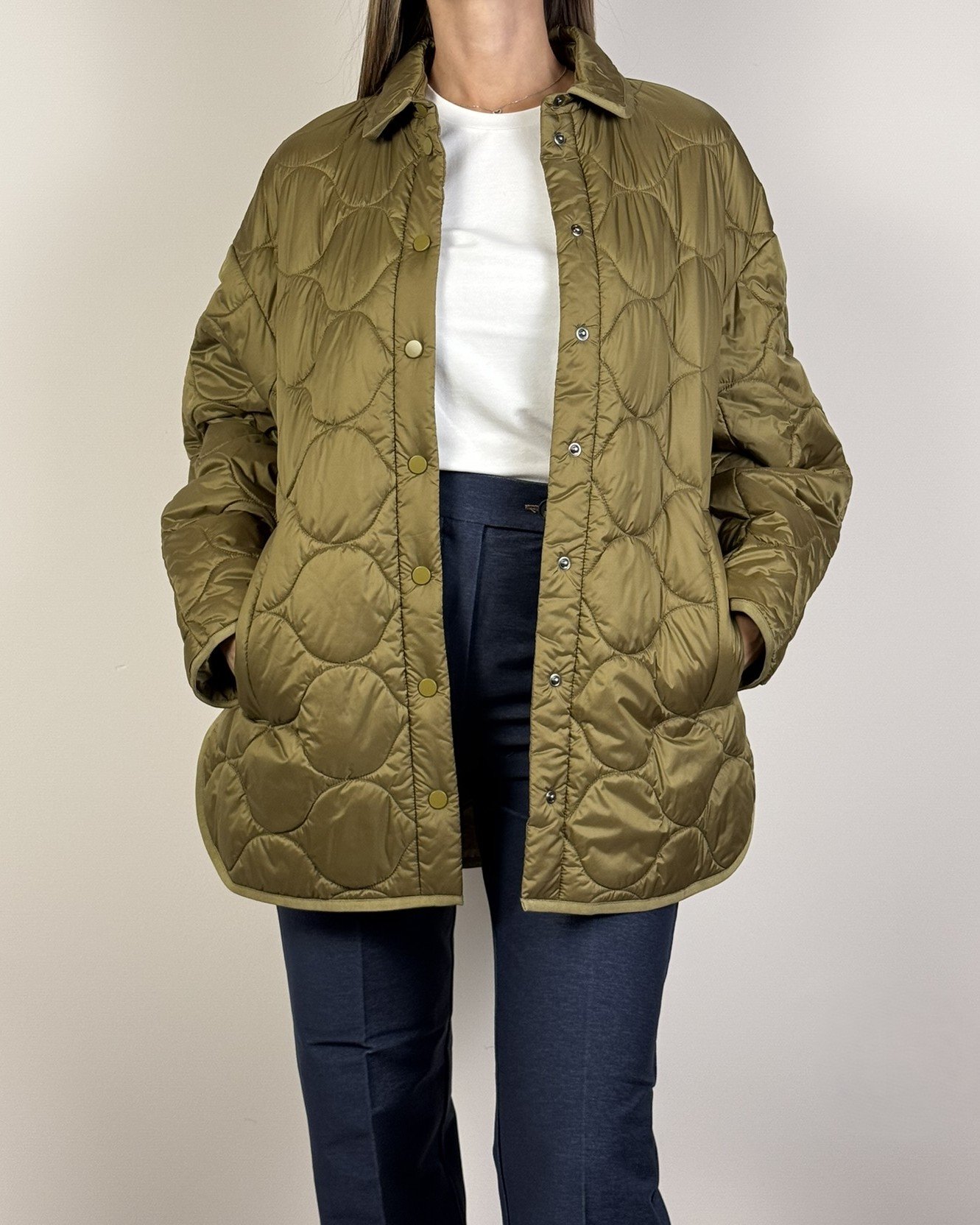 Overshirt in resistente nylon ultra-leggero e performante, antivento e antigoccia. Colletto a camicia, maniche lunghe, orlo stondato. Trapuntatura a losanghe e nastri in gros-grain. Imbottitura in Luxepad per un comfort termico ottimale. Chiusura sul davanti.
